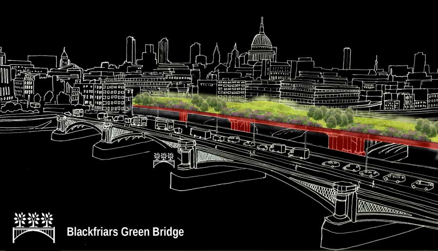 A series of four green infrastructure schemes: a fast commuter cycleway on raised railway viaducts, ‘air rail’ gardens beside railway sidings, a new iconic green bridge over Blackfriars Bridge and a floating flower show on static pontoons on the River.