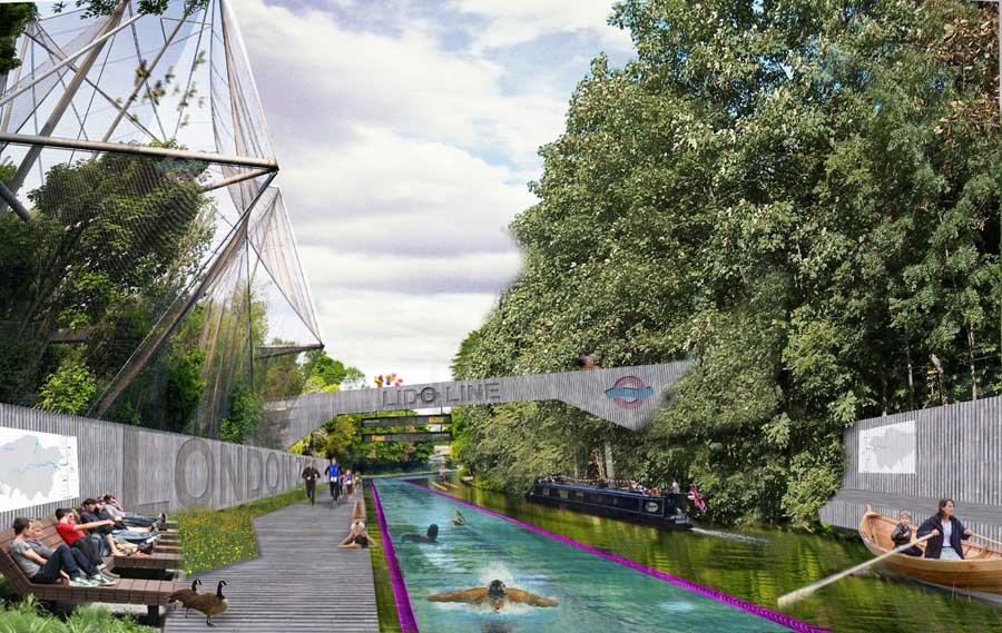 The Lido Line by [Y/N] Studio. An idea to insert a clean, safe ‘basin’ in the Regent’s Canal in which to swim the ‘Lido Line’ from Little Venice to Limehouse.