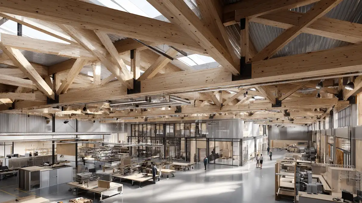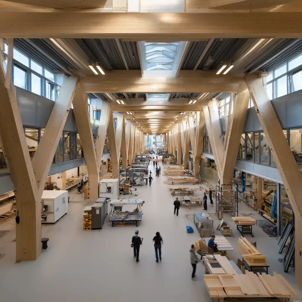 Behind the scenes, create a flexible making ecosystem: research labs, tool-safe maker studios, and digital fabrication (CNC, laser, robotics), organized around a double-height assembly hall with crane access for 1:1 prototyping. Support spaces—offices, loading, timber storage—connect to outdoor yards, green infrastructure, and trail links, with a covered prototype canopy and outdoor classrooms.