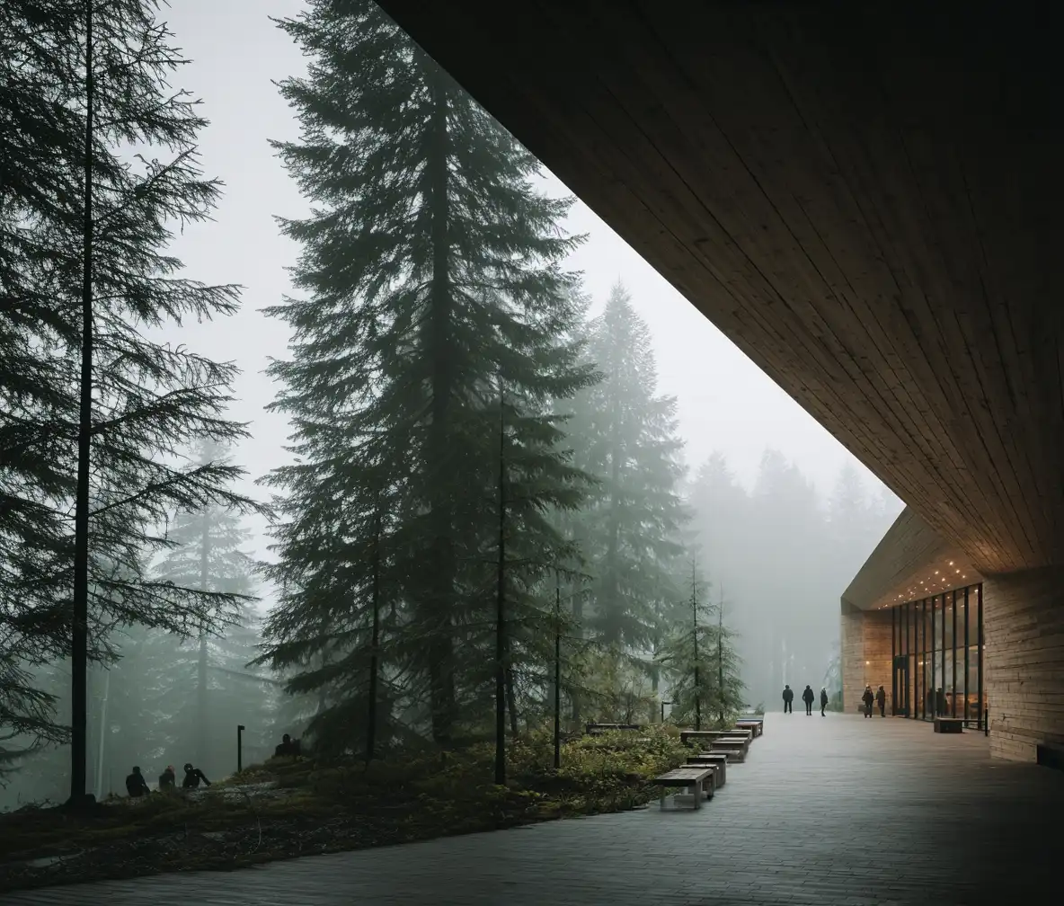 The competition seeks a public-facing hub where timber innovation is clear and inviting. A legible entry leads to a hands-on Discovery Lab, auditorium, café, and materials store, with trail-edge public amenities for park users. A central Timber Gallery anchors the visit through full-scale mockups and life-cycle storytelling.