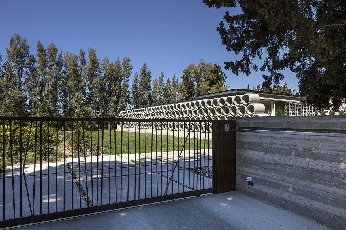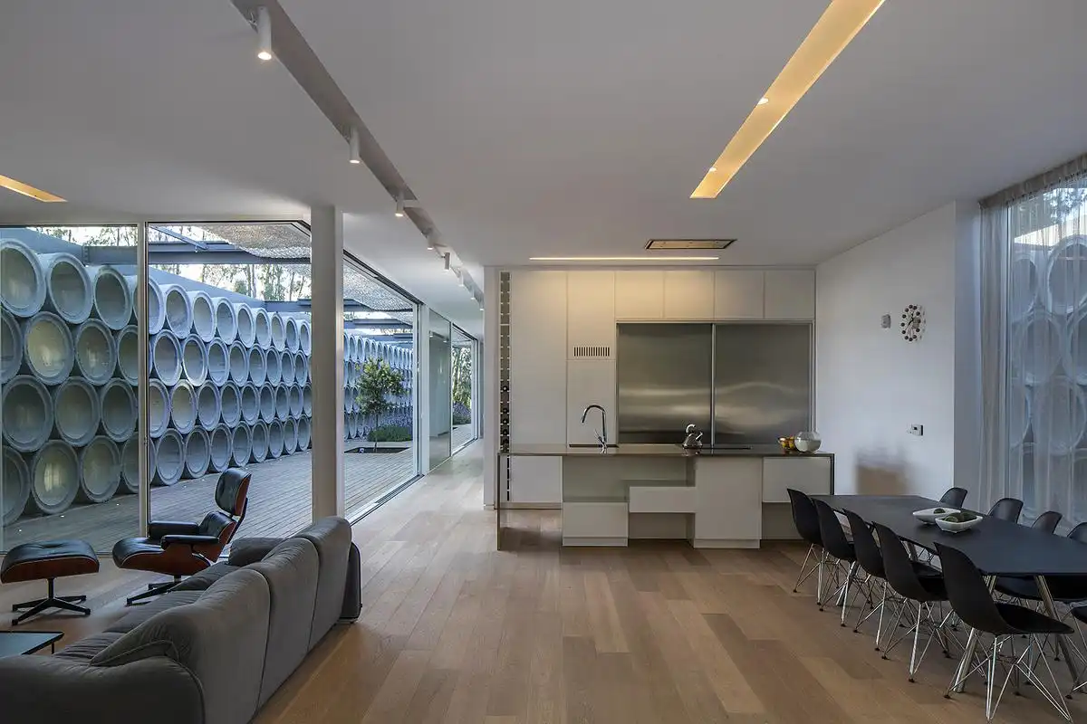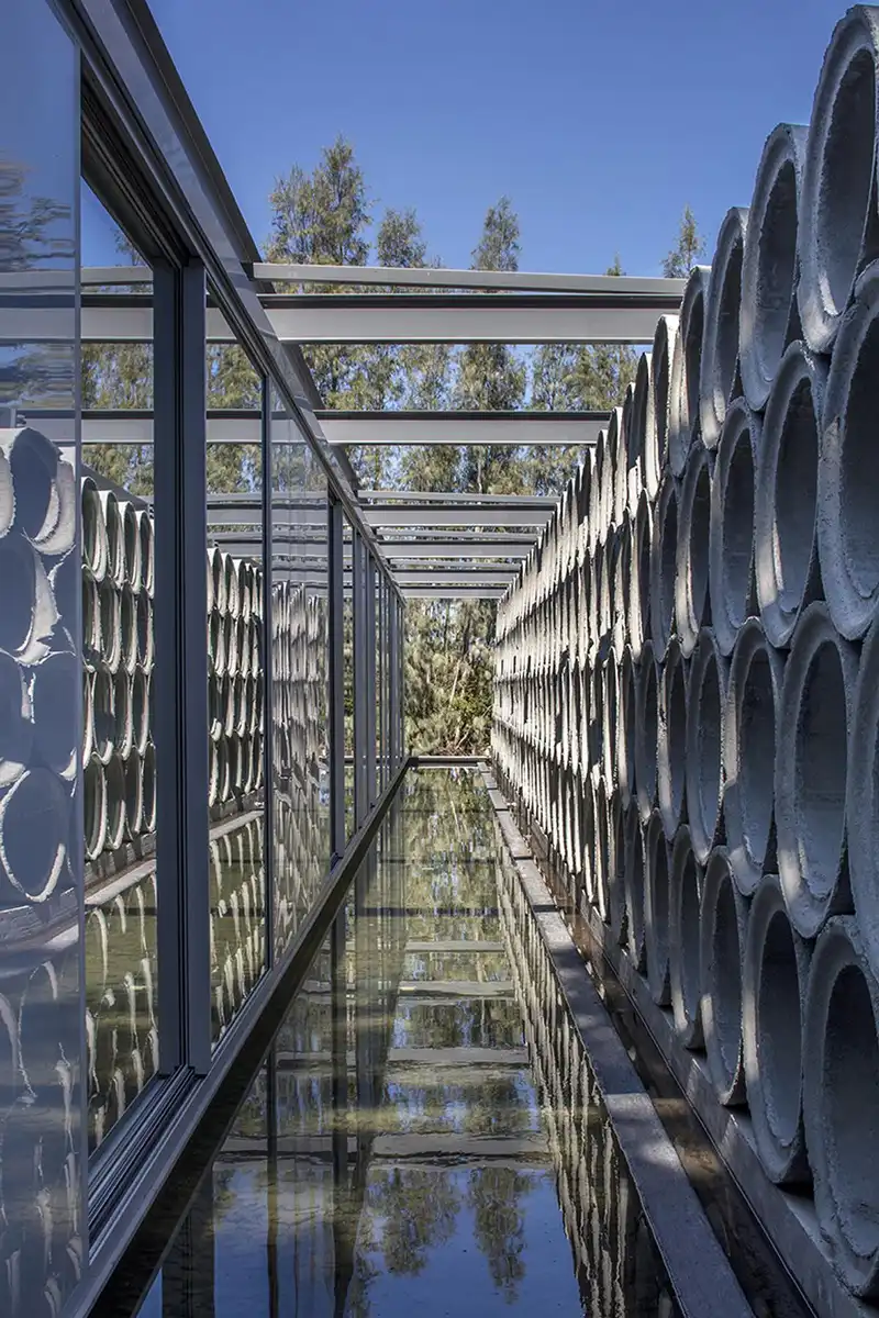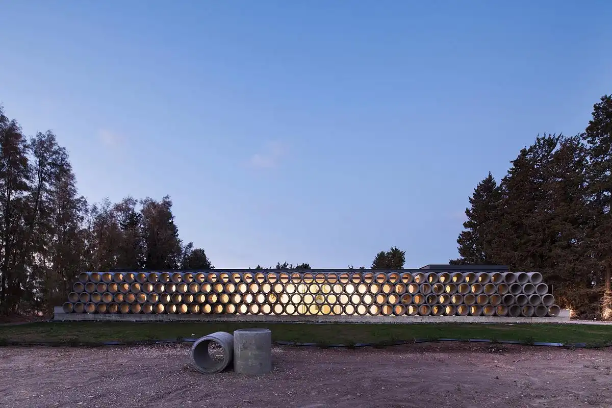 The second envelope consists of stacked concrete pipe sections running along the north and south façades. Heavy and low-tech in character, this layer provides solar protection, wind shelter, and visual privacy, defining the threshold between the private interior and the surrounding landscape.