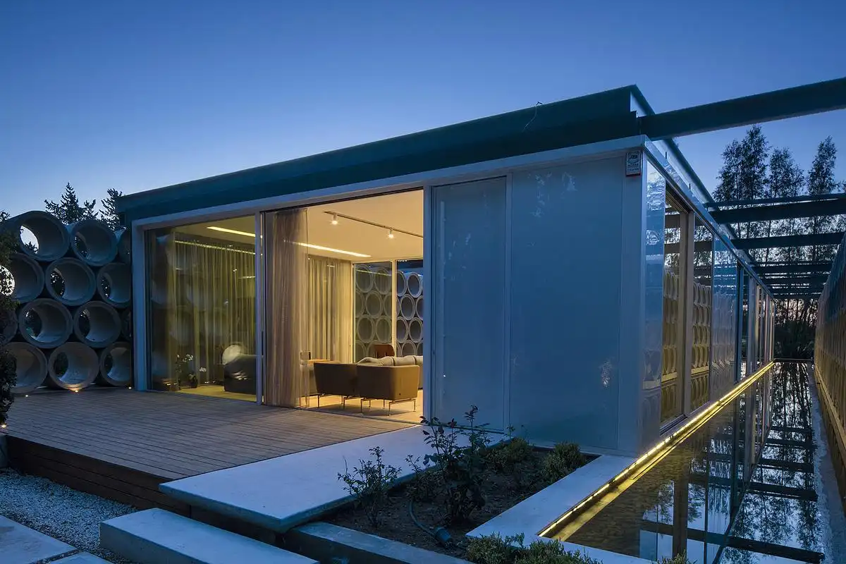 The first is a lightweight metal structure clad in glass and metal, forming the load-bearing framework of the house. Aluminium-framed glazing encloses the interior, offering uninterrupted views and a clean, minimal aesthetic.
