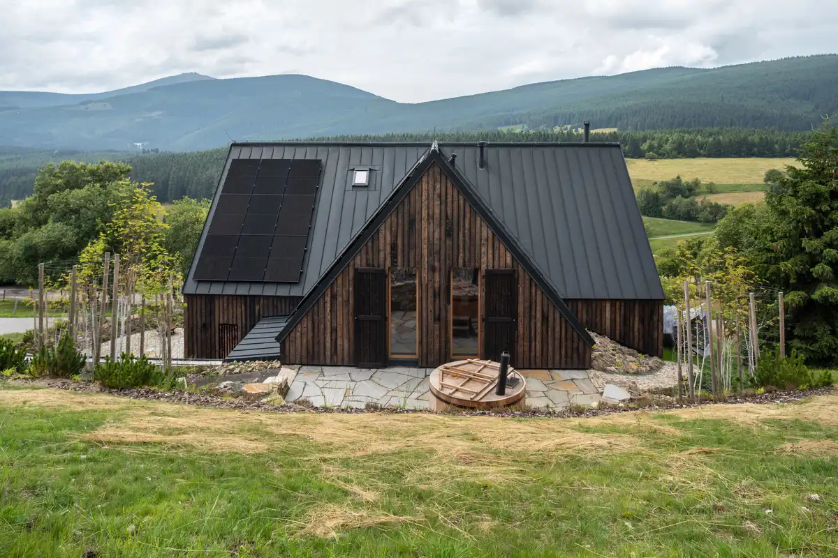 Despite the strict requirements of the National Park, the investor insisted on meeting the most demanding current standards for energy-sustainable living. The building is heated by a heat pump with geothermal boreholes, and photovoltaic panels are installed on the roof facing away from the valley.