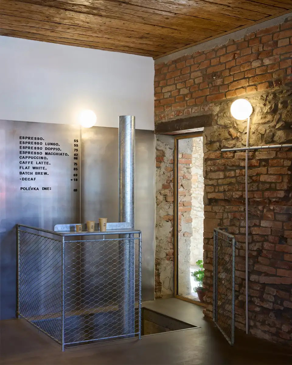 The historic building facing the square serves as a café. The exposed brickwork and beamed ceiling inside reveal the scars of past functions and alterations. The exposed interior structure houses a precisely designed stainless steel café counter and other necessary facilities such as toilets.