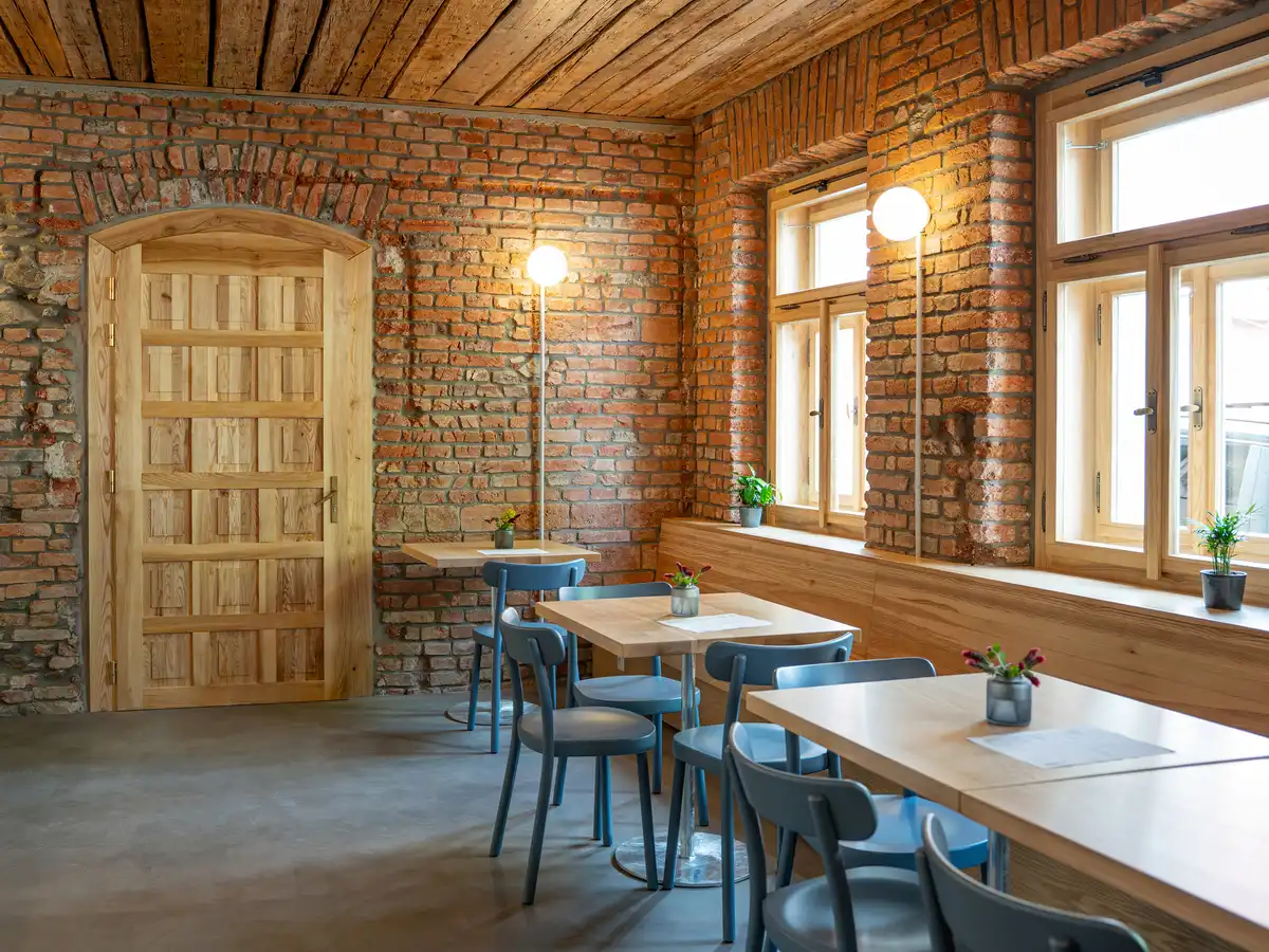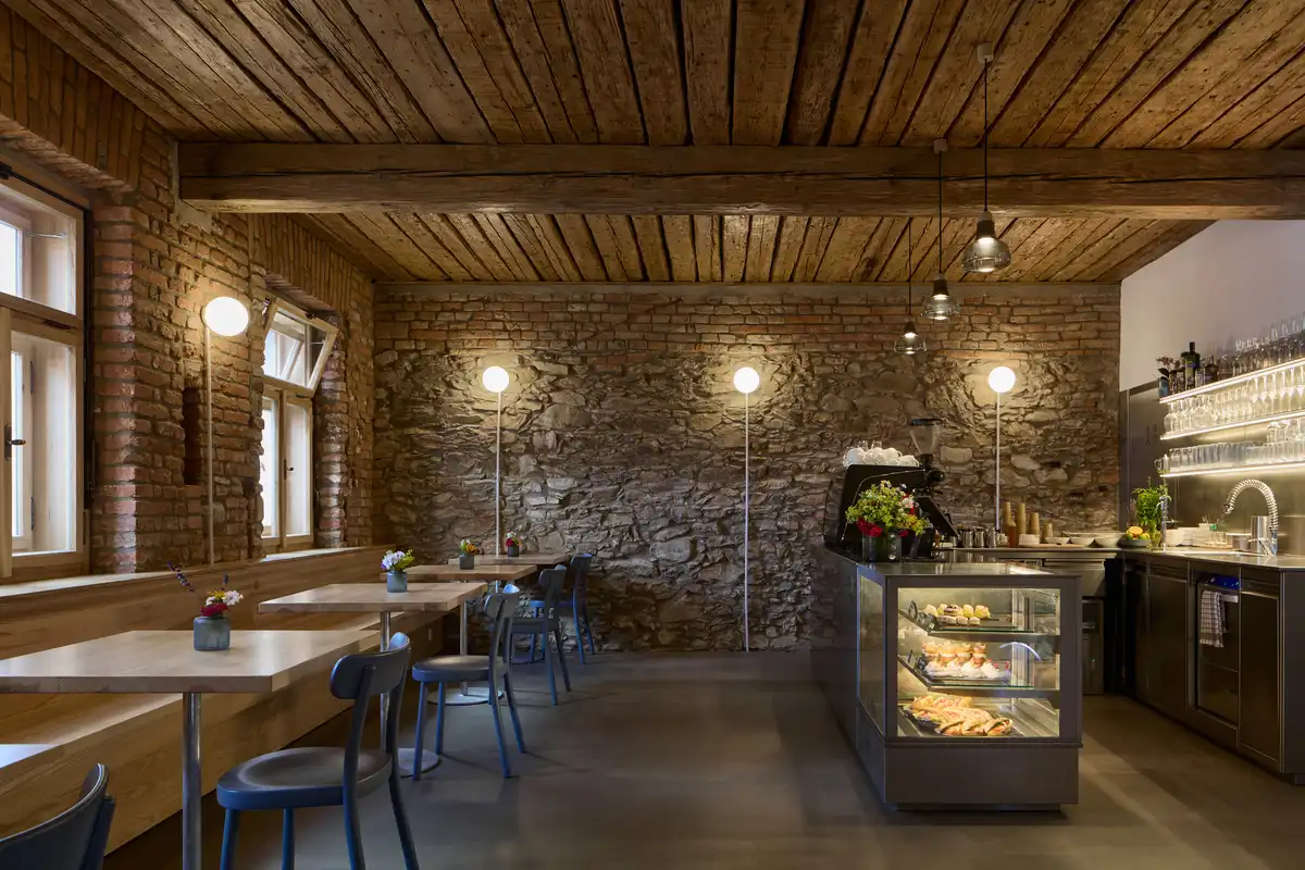 Guests sit on a long ash bench and blue chairs. This creates a colorful surface collage composed of authentic and natural materials – whether original or contemporary. The café bistro extends through a passageway to the courtyard, where guests sit on a long concrete bench.