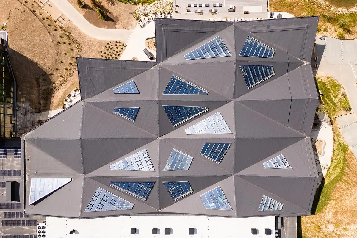 The roof structure is seemingly simple with a repeated grid of four columns with different heights, supporting a triangulated roof, but the visual effect is powerful and far from simple. When seen from above you can see, that the structure is inspired by a folded piece of paper, and is sometimes referred to, as an “origami roof”.