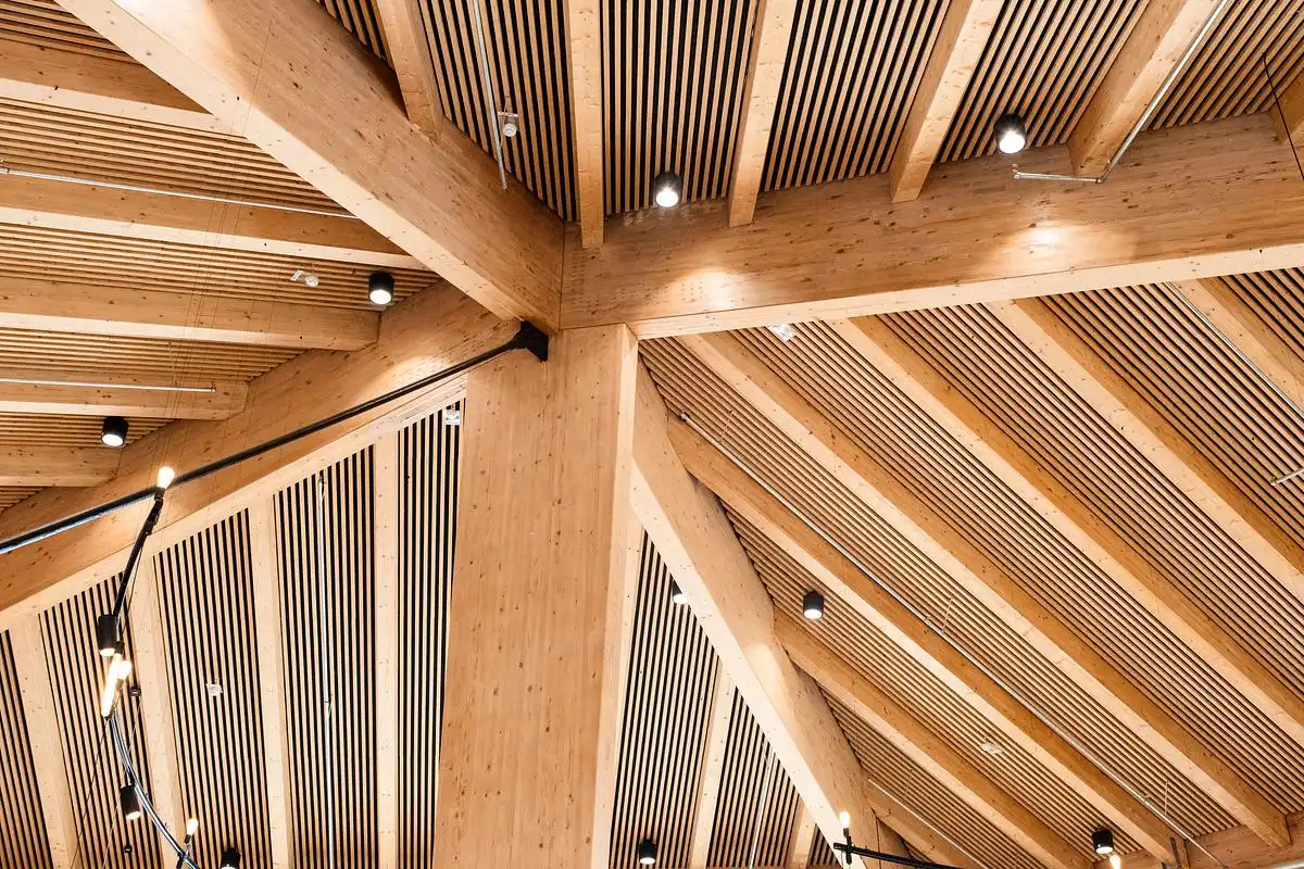 The architects wanted a stroll through the Market Dome to resemble a walk through a beech forest. Large wooden columns, like tree trunks, support an undulating wooden roof structure.