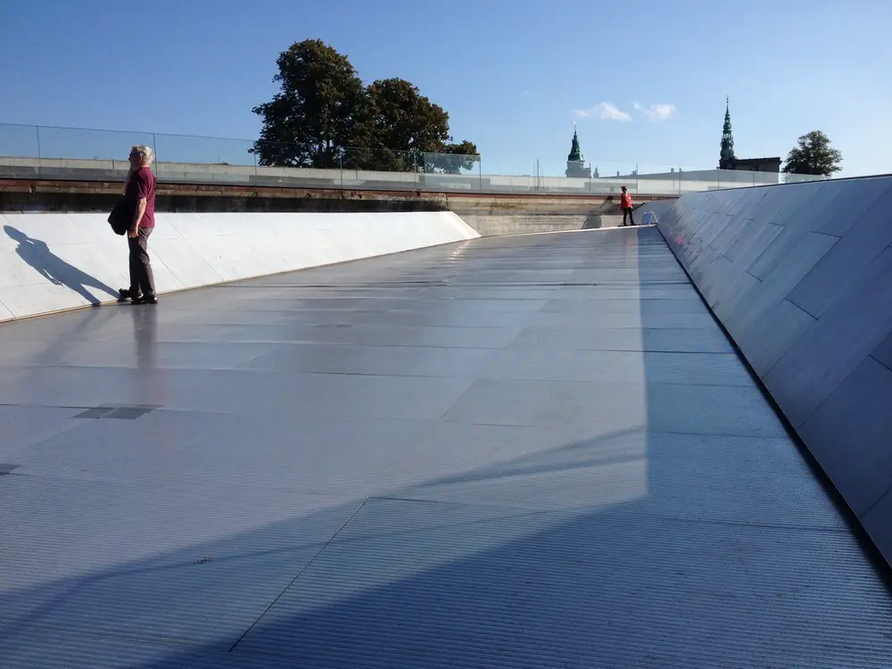 A series of three double-level bridges span the dry dock, serving both as an urban connection, as well as providing visitors with short-cuts to different sections of the museum. The harbor bridge closes off the dock while serving as harbor promenade; the museum’s auditorium serves as a bridge connecting the adjacent Culture Yard with the Kronborg Castle; and the sloping zig-zag bridge navigates visitors to the main entrance. This bridge unites the old and new as the visitors descend into the museum space overlooking the majestic surroundings above and below ground. The long and noble history of the Danish Maritime unfolds in a continuous motion within and around the dock, 7 meters (23 ft.) below the ground. All floors – connecting exhibition spaces with the auditorium, classroom, offices, café and the dock floor within the museum – slope gently creating exciting and sculptural spaces.