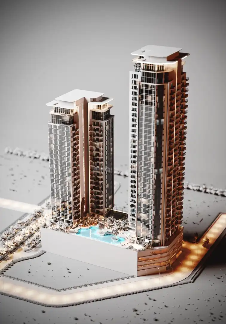 The complex comprises two towers: one 23-storey and another 30-storey. Each tower features an exclusive penthouse level with private pools on the terraces, alongside premium commercial and lobby spaces. The project spans 4000 square meters and includes four podiums with 535 parking slots. Residents enjoy a state-of-the-art gym with a terrace for practicing yoga, four steam rooms, sperate lockers and showers facilities, pools for children and adults, landscape gardens, and flexible common areas. Additional amenities include two BBQ zones, kid zones, and multipurpose public space – design for business and social gatherings.