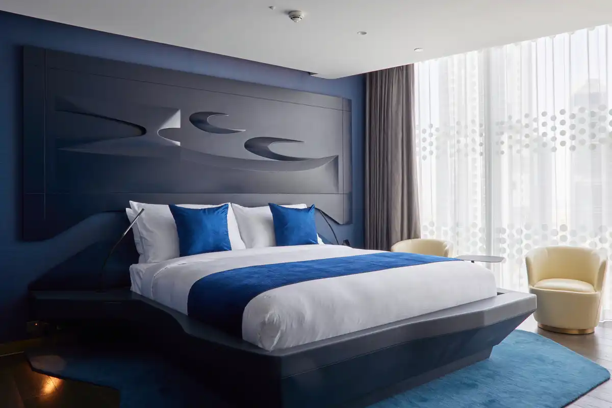 Furniture by Zaha Hadid Design is installed throughout the hotel, including the ‘Petalinas’ sofas and ‘Ottomans’ pods in the lobby that are fabricated from materials ensuring a long lifecycle and its components can be recycled. The ‘Opus’ beds in each bedroom while the ‘Work & Play’ combination sofa with desk are installed in the suites. The hotel’s bedrooms also incorporate the ‘Vitae’ bathroom collection, designed by Hadid in 2015 for Noken Porcelanosa, continuing her fluid architectural language throughout the hotel’s interiors.