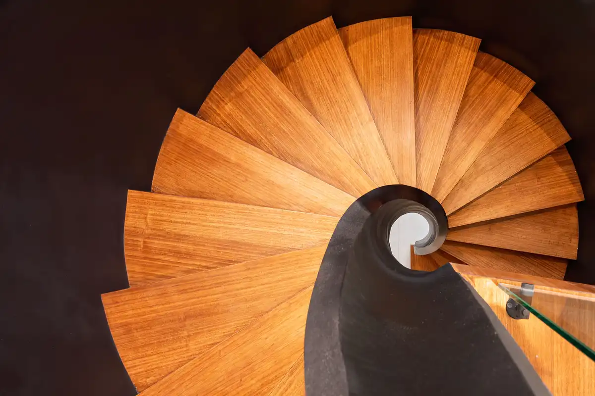 A secondary helical staircase serves as a sculptural centerpiece, embodying the project’s conceptual essence. Its steps are suspended in the air, visually reinforcing the concave-convex theme that runs throughout the house.