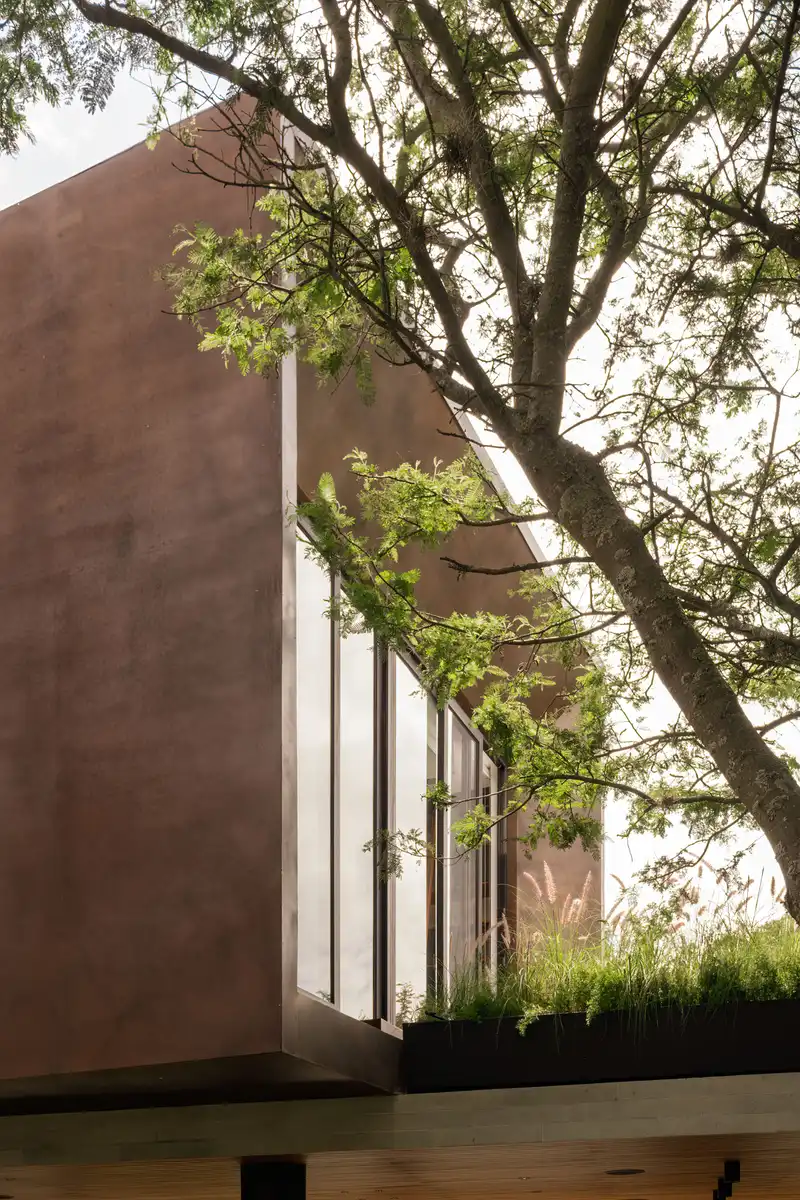 To link the main volumes, a black corrugated metal connector is introduced, providing contrast with the oxidized metal. This connector houses secondary spaces such as bathrooms and circulation areas. The façade’s materiality tells the internal story of the house, making the spatial organization legible from the outside.