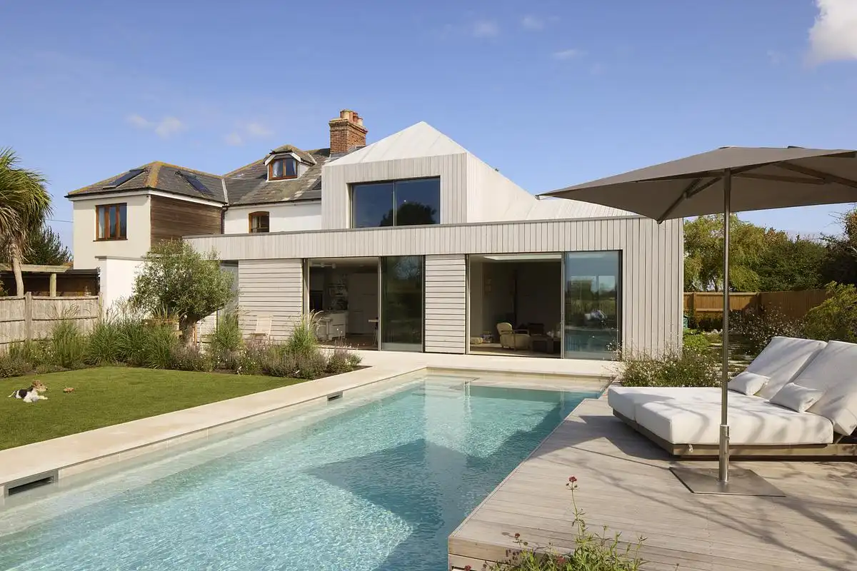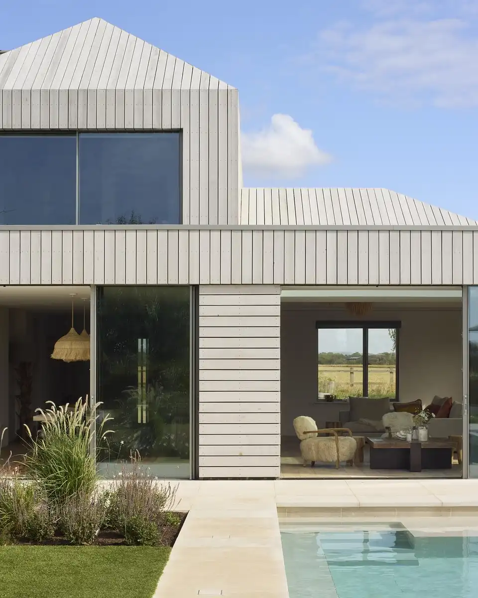 Slimline sliding glazing opens the main living spaces directly to the garden and pool terrace, creating a seamless flow between indoors and outdoors. Upstairs, expansive glazing captures wide views of the countryside and coastal horizon, reinforcing the home’s connection to its setting.