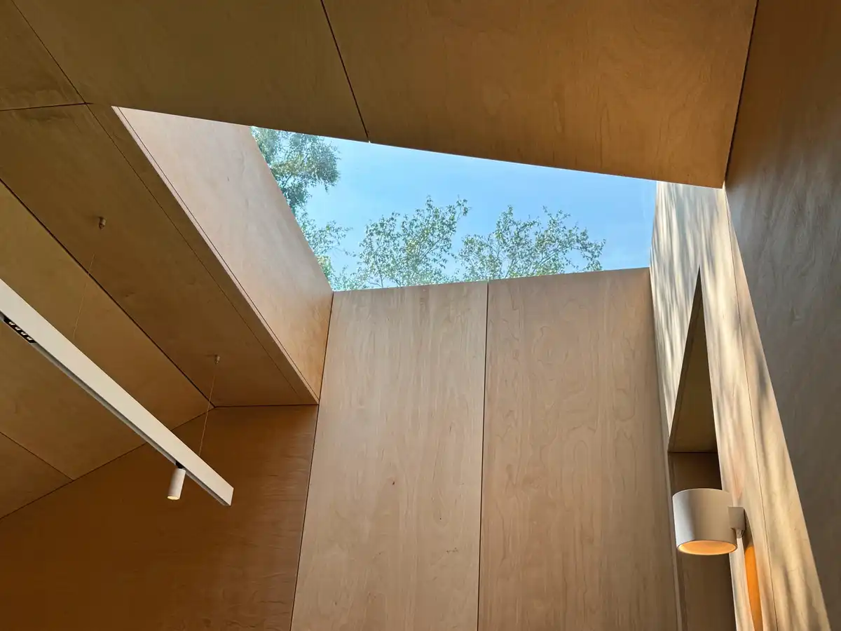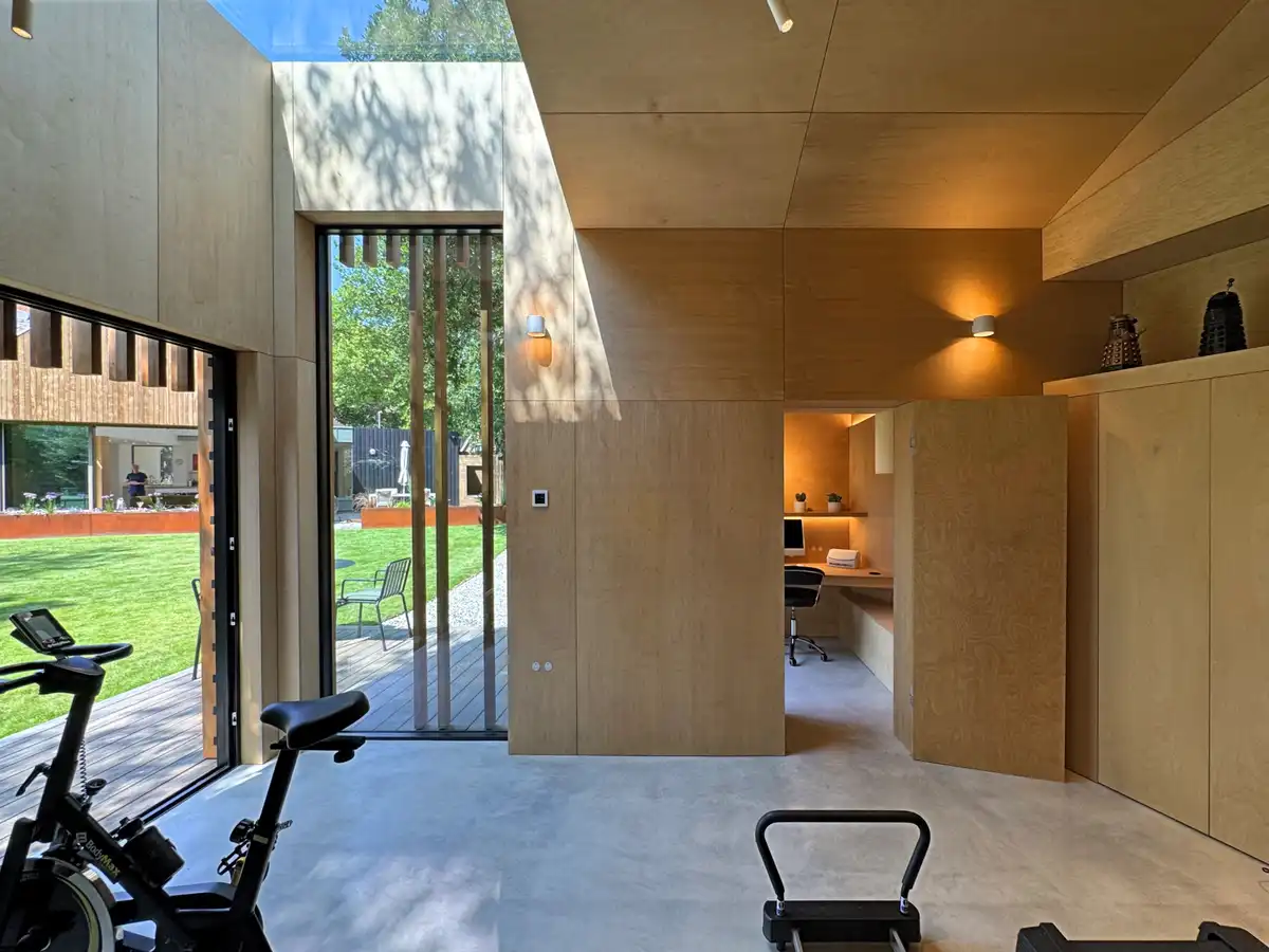 The standalone garden studio comprises two distinct volumes: a home office and a gym. The office opens onto a timber deck overlooking the lawn, while the gym features a sculptural roofline with a frameless rooflight. Interiors are lined in warm plywood, folding into integrated desks, shelves, cupboards, and bench seating. Externally, cedar shingles and vertical fins over black-stained battens echo the extension’s materiality and give depth to the façades.