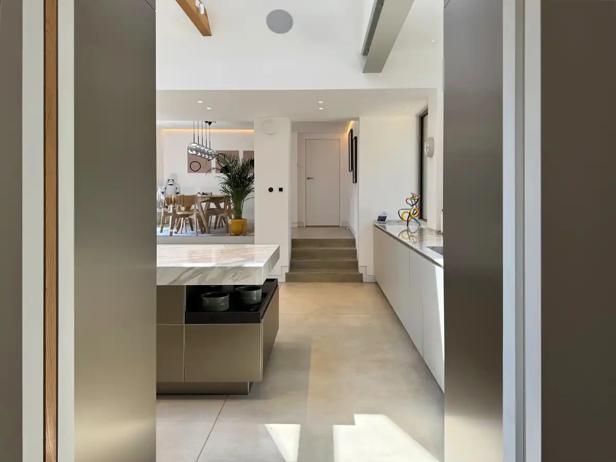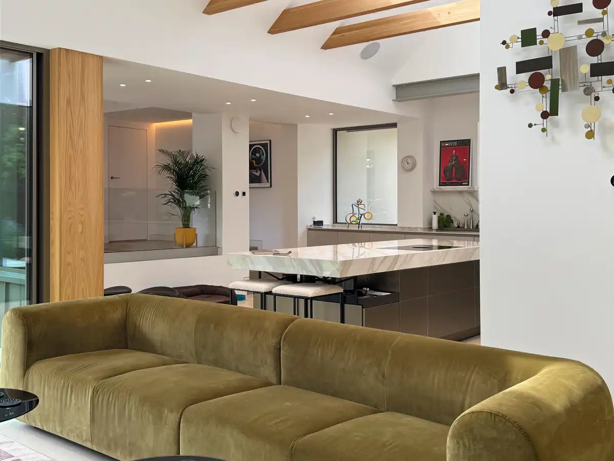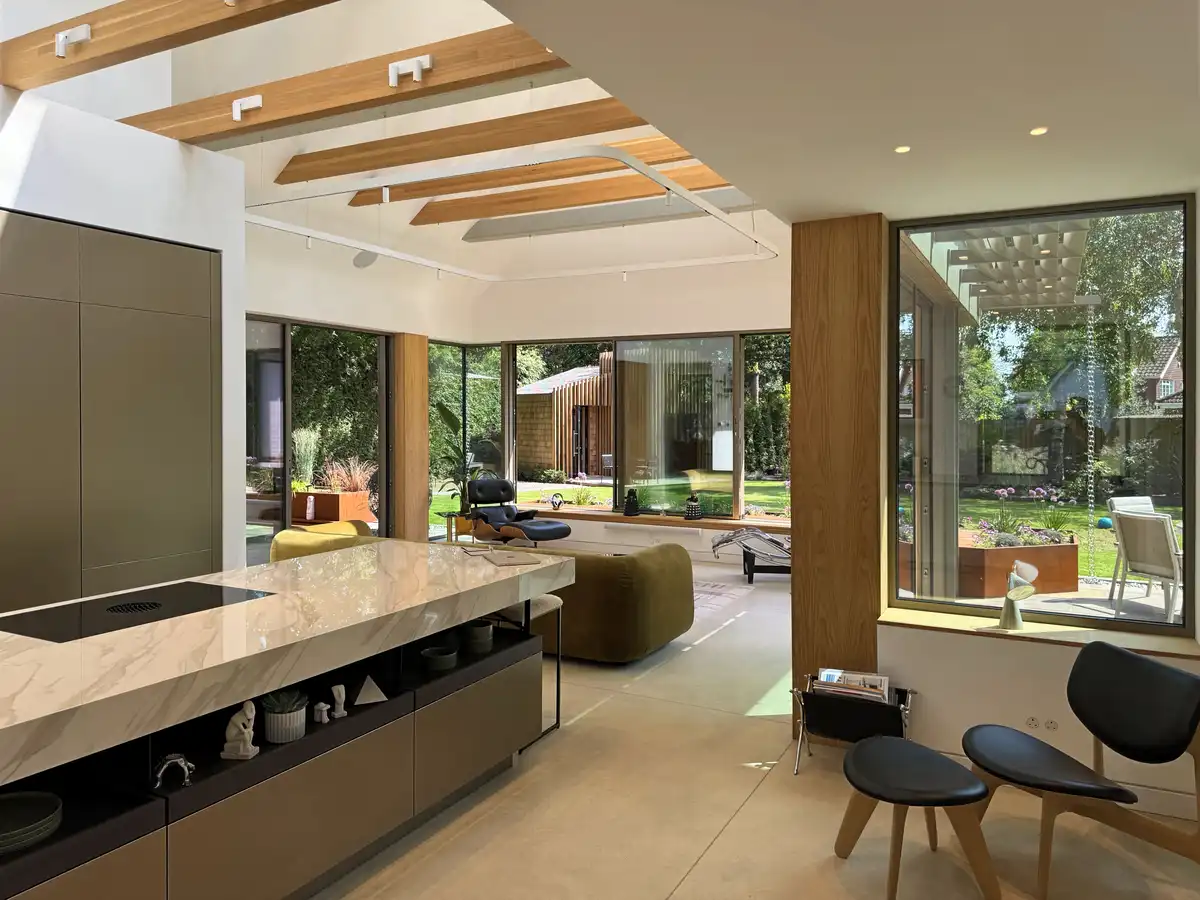 Internally, the ground floor of the extension has been reorganised around an open-plan kitchen, dining, and living area. Polished concrete floors and exposed oak beams define the space. Slim-framed tripleglazed sliding doors open to patios on both sides, while flush rooflights pull daylight deep into the plan.