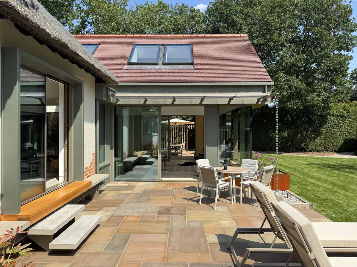 The project involved a side and rear extension to the existing cottage, alongside a standalone garden studio. The extension features a gabled volume clad in western red cedar fins and folded green zinc, while a glazed link separates the new and original structures. The roof pitch of the extension echoes the thatched roof of the cottage, and crisp detailing signals the contemporary addition.