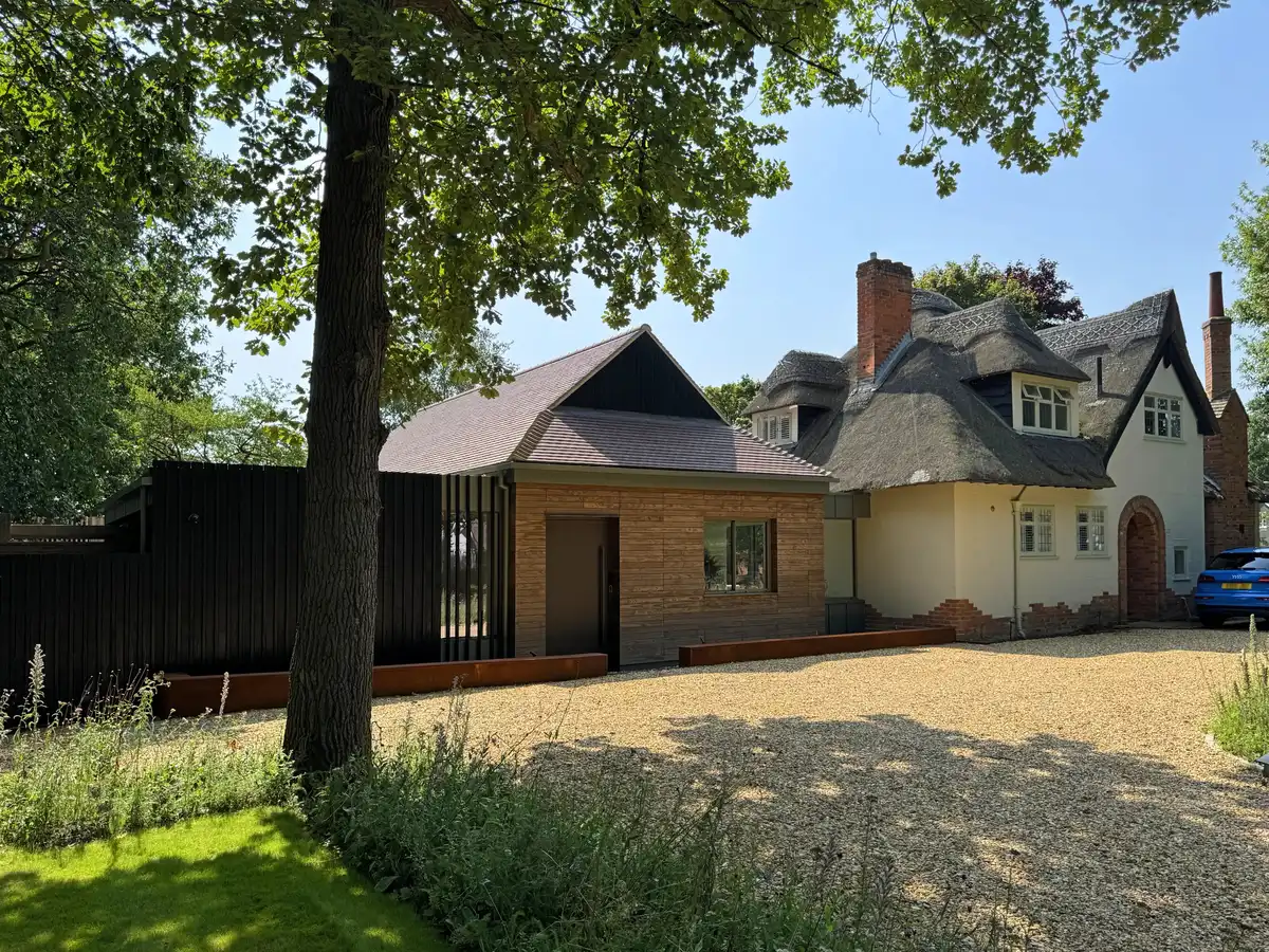 London-based 2PM Architects has completed a contemporary extension and garden studio at a 1930s thatched cottage in rural Essex. The project provides additional living space, home working and fitness areas, and strengthens the connection between the house and its mature garden, which includes protected oak trees.