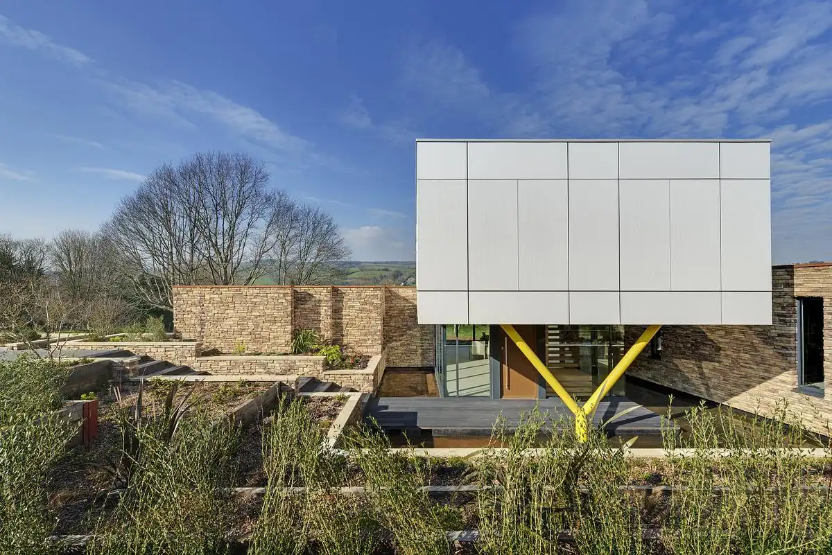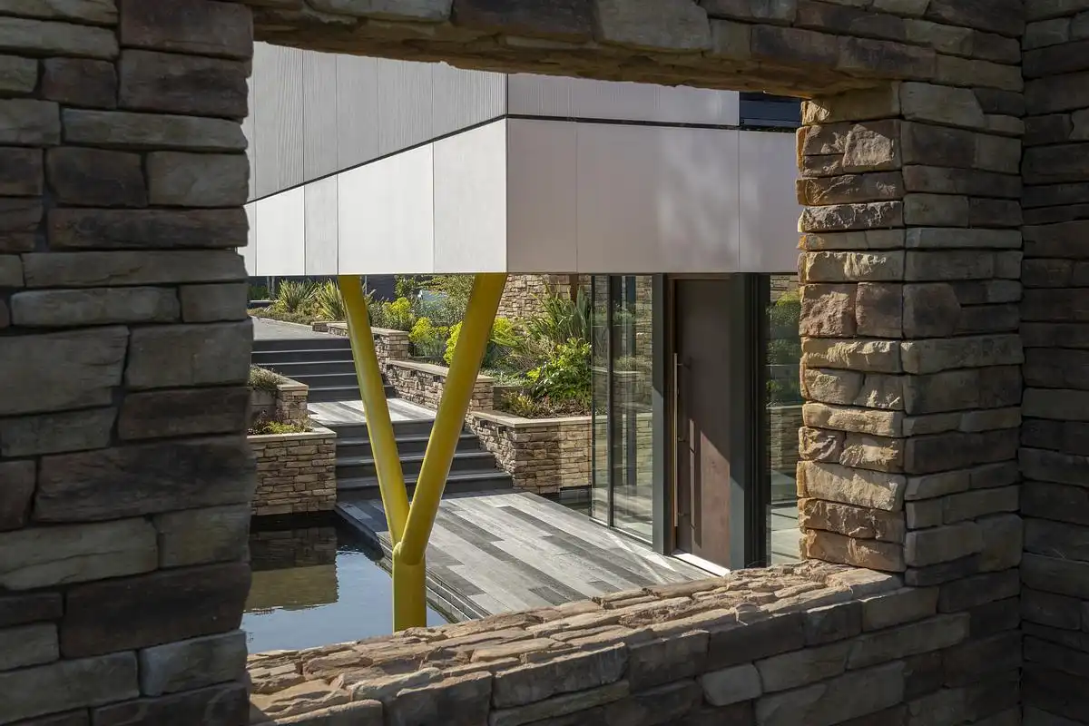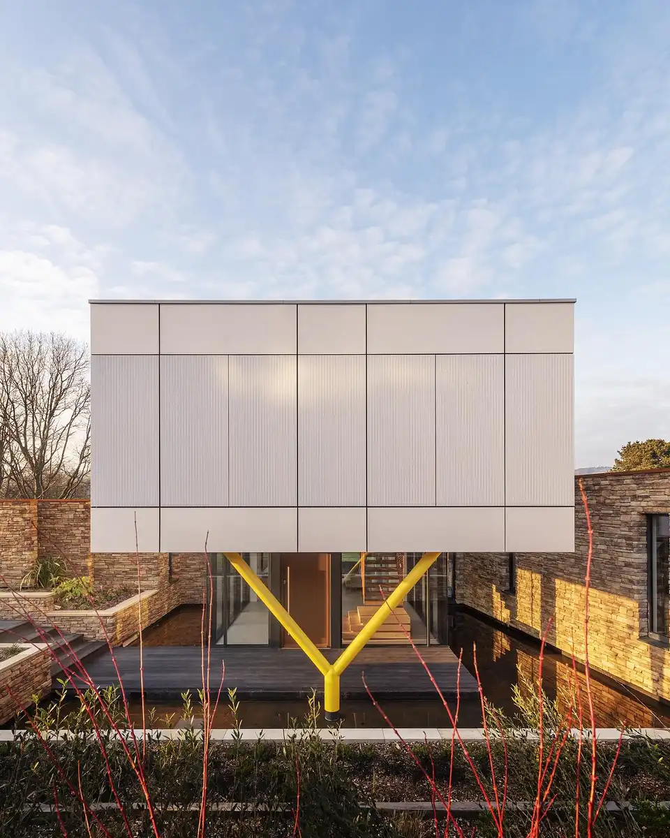 The first floor of the building was designed as a contrast to the walled courtyard. Where the courtyard appeared as a dry-stone wall, the first floor was clad in a variety of textured white fibre cement panels. The form of the first floor was also consistant with this contrasting approach, designed as a purer white rectangle, orientated perpendicular to the courtyard, that cantilevers over the glazed entrance hall and which is supported on a yellow ‘Y’ column that sits within the reflection pool.