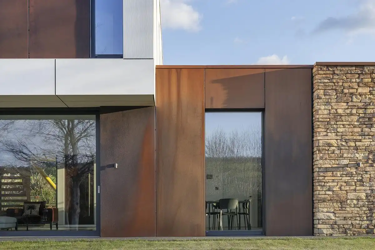 The first floor is clad in a mixture of smooth and ribbed fibre cement panels, with accents in recesses provided by additional corten panels. All windows and doors use marine-grade powder coating to prevent degradation in a saline environment.