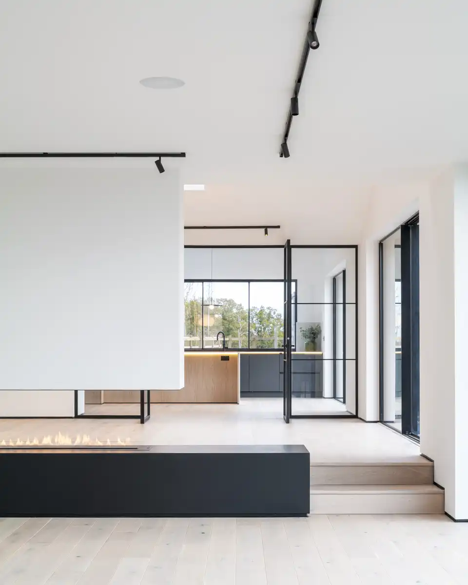 In contrast to the dark exteriors, the property interiors will be light, bright and filled with natural tones. The neutrality of the interior design will create a luxurious backdrop for prospective owners to inhabit and personalise. The design principle inside is to express the forms through, for example, vaulted high ceilings. Full-height, glazed crittal style doors will be used internally to create a connection between the primary living spaces and entrance hall. Stairs, some light and some solid, reflect the various internal layouts of the properties. The staircases will feature a crafted handrail with metal balusters and either a slatted or solid timber balustrade. There will be a slatted wall next to the ‘floating’ stairs along with a wall-mounted timber handrail.