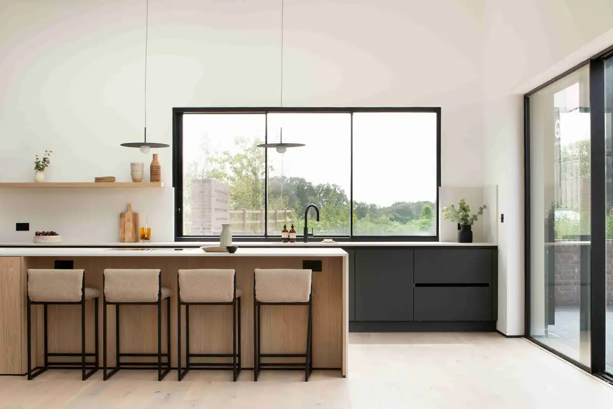 In contrast to the dark exteriors, the property interiors are light, bright and filled with natural tones. The neutrality of the interior design creates a luxurious backdrop for prospective owners to inhabit and personalise. The design principle inside is to express the forms through, for example, vaulted high ceilings, whilst full-height, glazed Crittall-style doors create a connection between the primary living spaces and entrance hall. Stairs, some light and some solid, reflect the various internal layouts of the properties. The staircases feature a crafted handrail with metal balusters and either slatted or solid timber balustrades. A slatted wall sits next to any ‘floating’ stairs, along with a wall-mounted timber handrail.