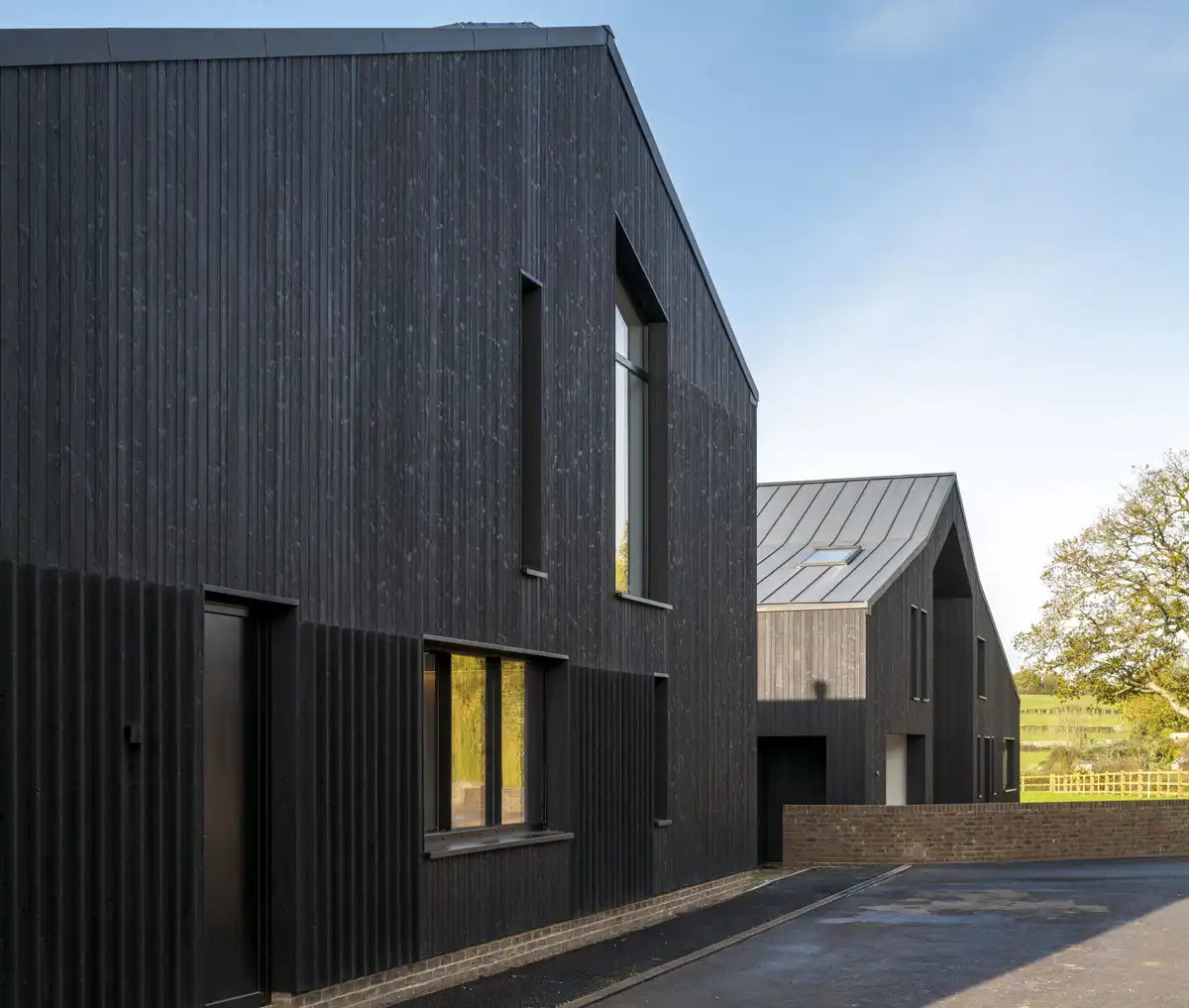 The houses are clad in striking charred larch and come complete with a wide range of energy-efficient features, including air source heat pumps, solar photovoltaic panels, extensive insulation, MVHR systems and electric car charging points. The Hartdene Barns development of highly-sustainable homes was also designed to meet RIBA Climate Challenge 2025 criteria.