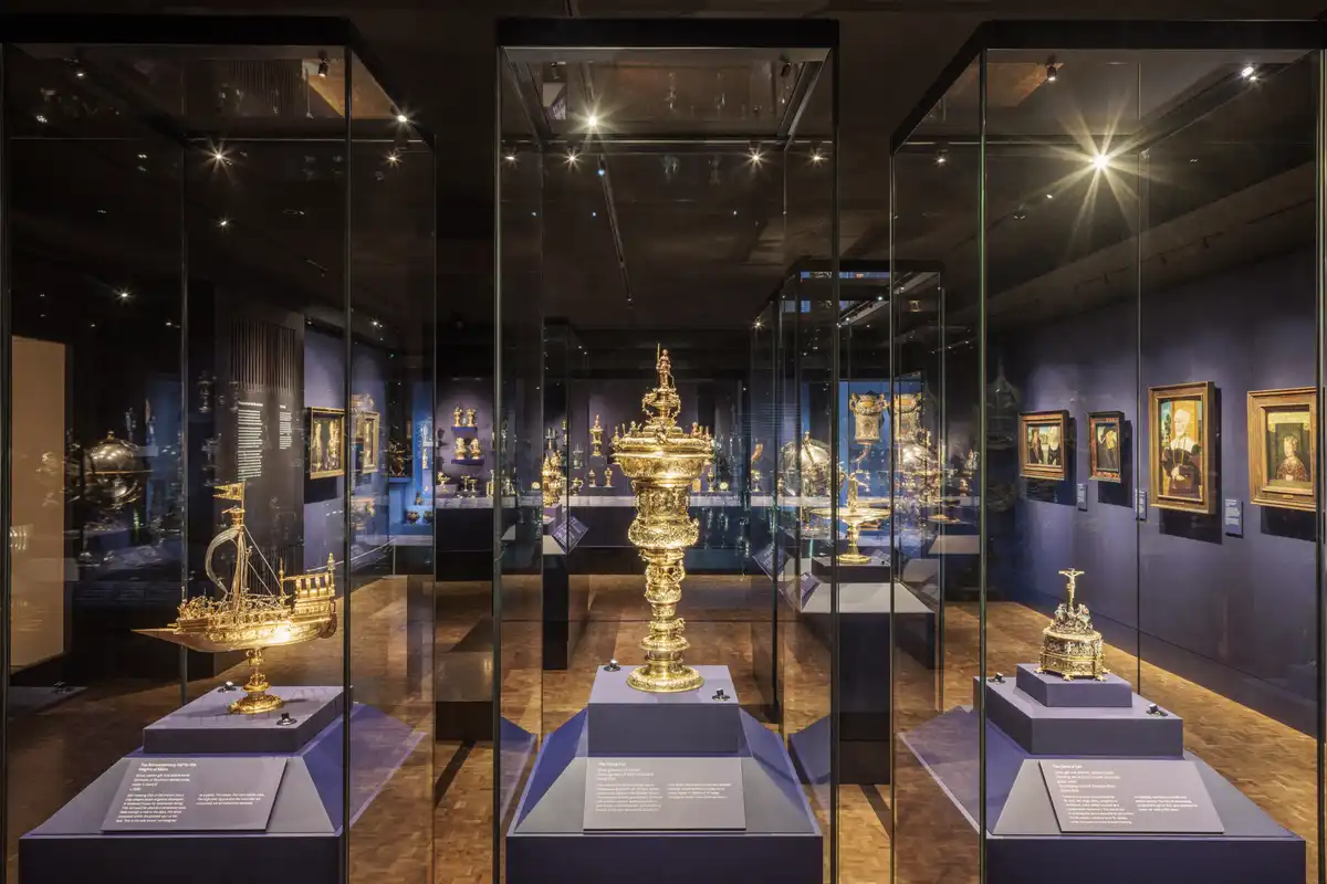 The architectural concept for the lower-ground level gallery evokes the atmosphere of an intimate treasure chamber—an immersive space of curated wonders. A restrained material palette and carefully controlled lighting strategy draw attention to the richness and intricacy of the artworks on display. The exhibition design features bespoke modern display cases lined with carefully selected blue tones that highlight and complement the silverware and maiolica on display. These cases are paired with fabric-lined walls that provide an elegant backdrop for the hanging of Renaissance paintings.