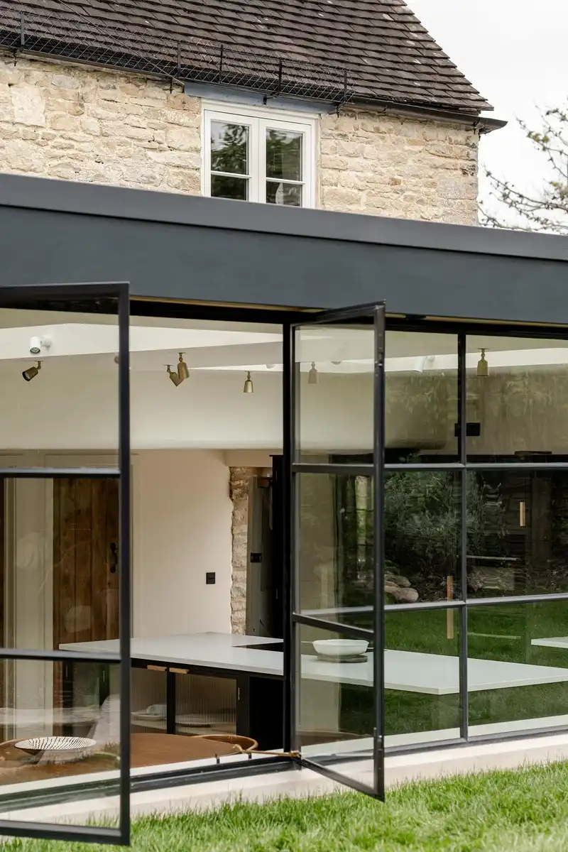 Second, we were very careful with materials and detailing. We used Cotswold stone where visible and paired it with a lightweight steel-and-glass structure, allowing the addition to feel contemporary yet unobtrusive. A conservation-style rooflight and a low, simple roofline helped it sit comfortably within the wider heritage context.