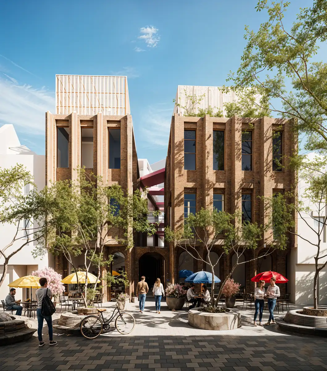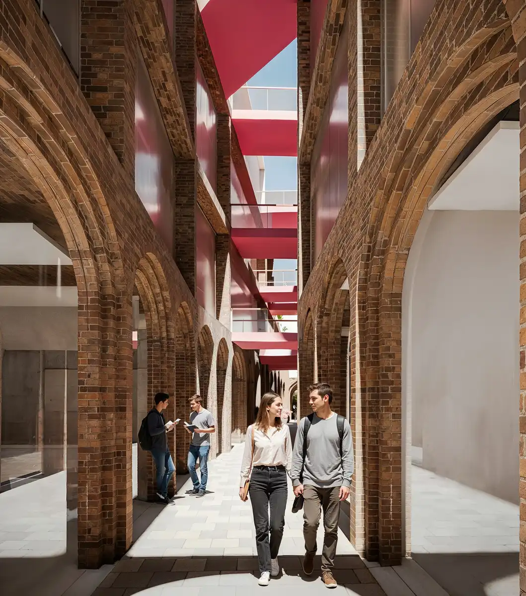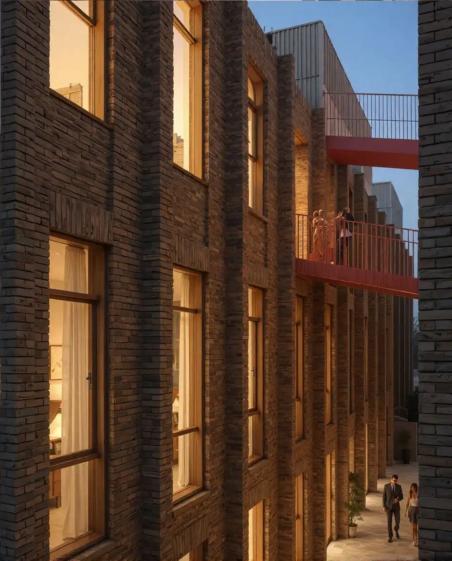 Material expression is central to the architectural language. Brick forms the primary material, selected for its weight, durability, and capacity to express depth. Deep vertical piers and recessed glazing create a layered façade that registers light and shadow across the day, allowing the building to change subtly without losing its identity. The material strategy reinforces permanence rather than surface effect.