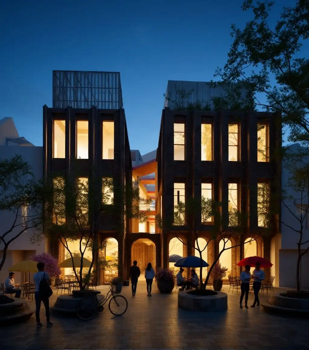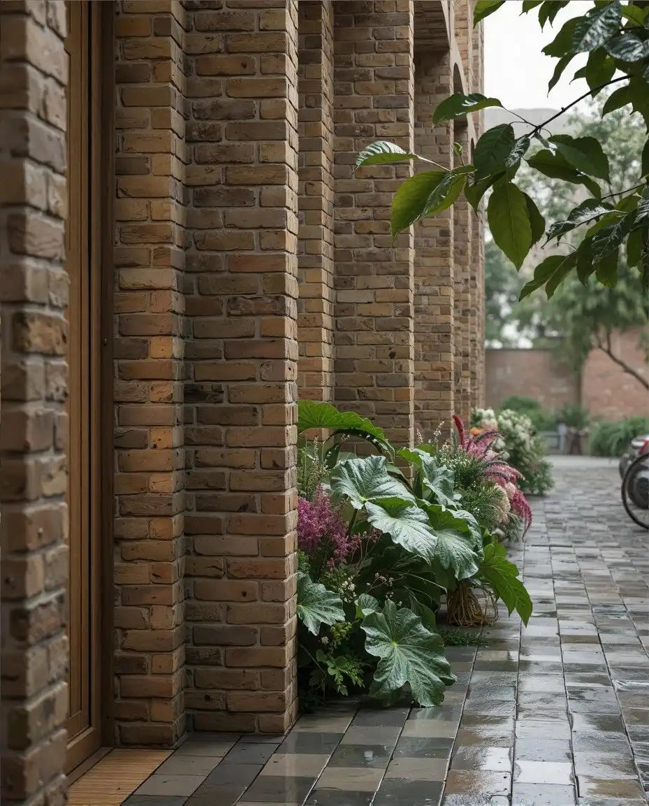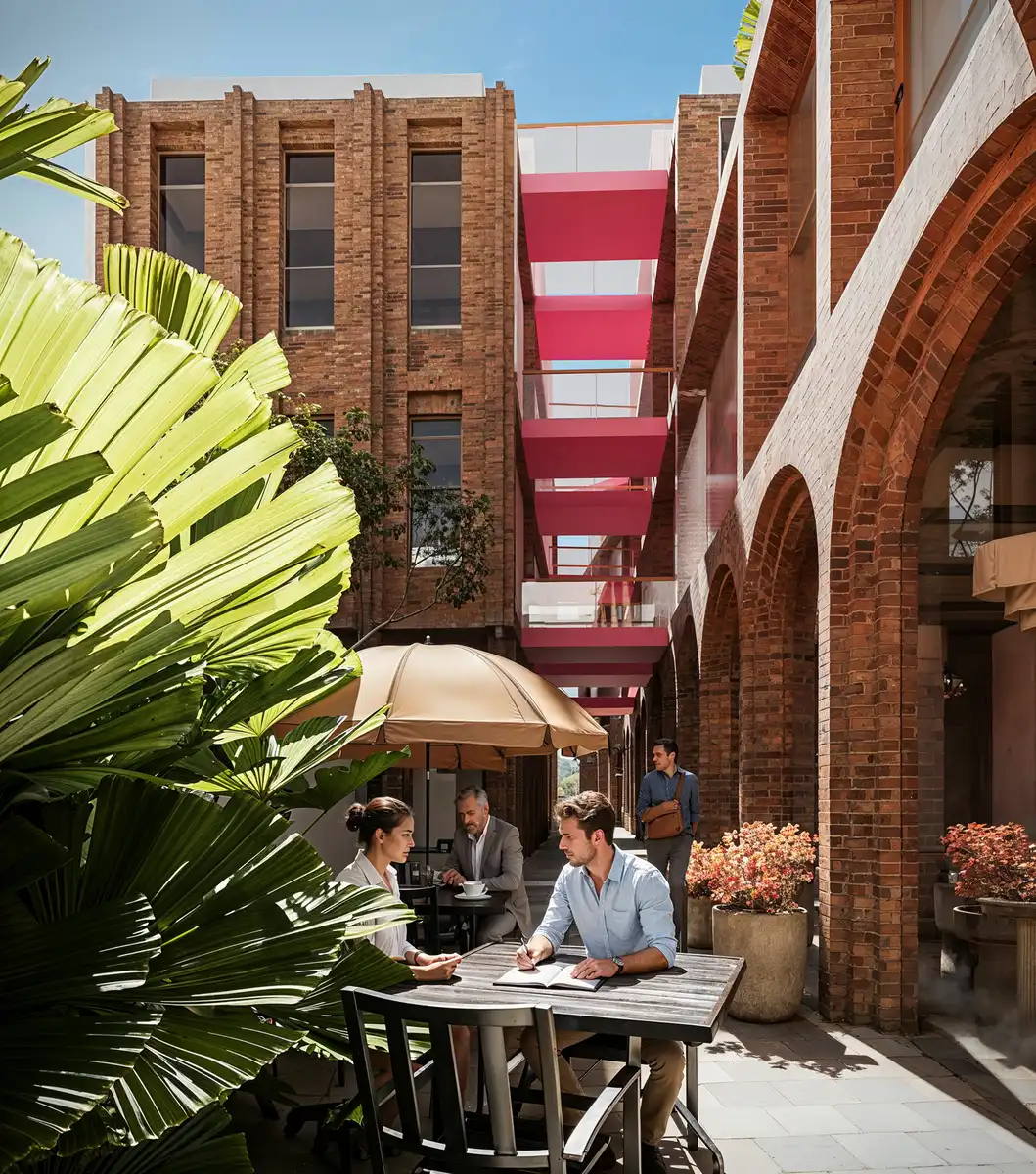Material expression is central to the architectural language. Brick forms the primary material, selected for its weight, durability, and capacity to express depth. Deep vertical piers and recessed glazing create a layered façade that registers light and shadow across the day, allowing the building to change subtly without losing its identity. The material strategy reinforces permanence rather than surface effect.