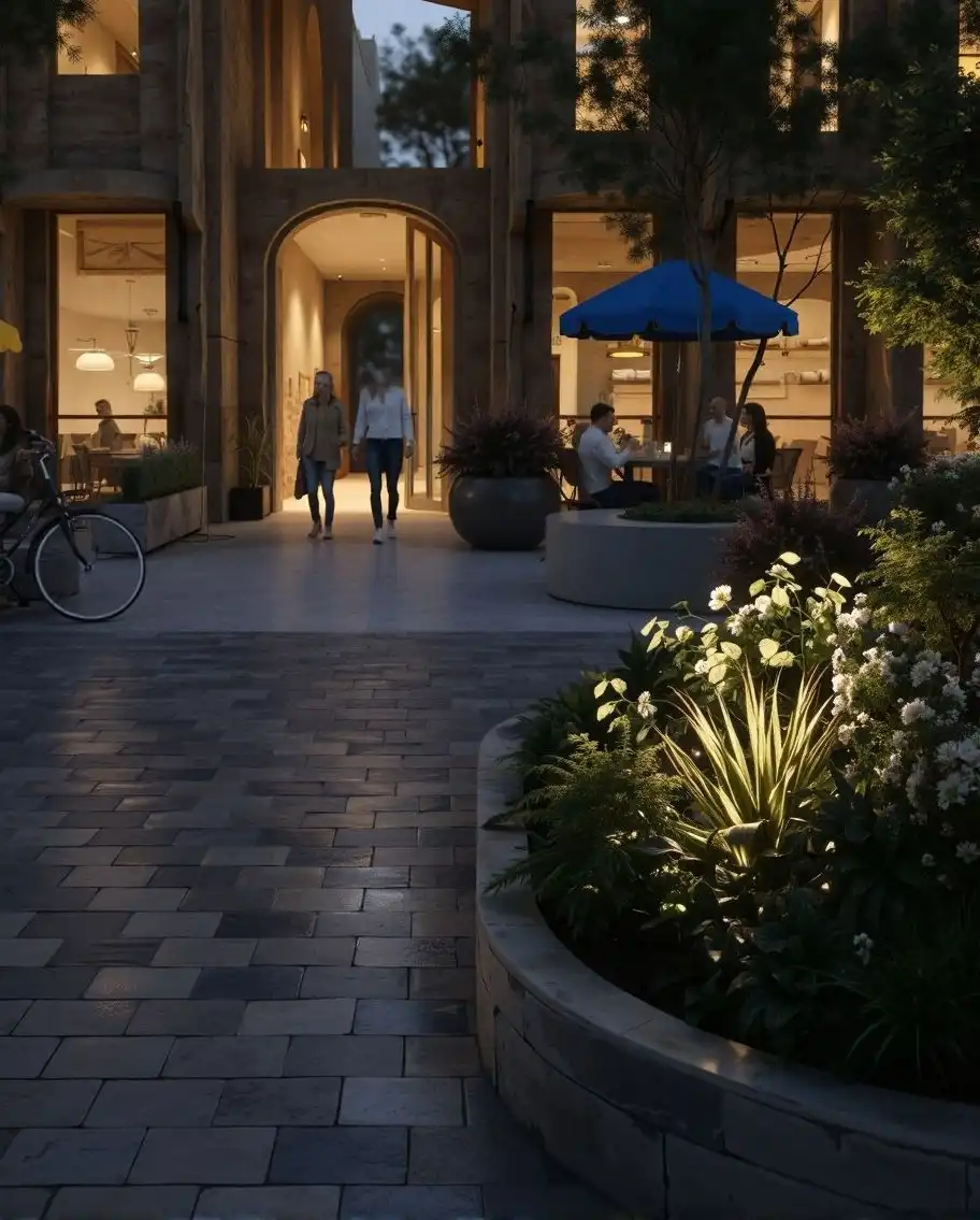 A landscaped threshold extends the public realm toward the building edge. Tree planting and integrated seating soften the transition between street and structure, creating moments of pause within an otherwise linear and fast moving environment. This space is conceived as part of the street itself, reinforcing the building’s civic presence rather than separating it from its surroundings. The threshold supports both movement and lingering.