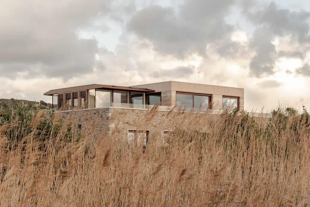 The interior layout is somewhat inverted, with the ground floor housing the private bedrooms; a calm, sheltered layer beneath the light-filled living spaces above. The primary suite faces the sea, cocooned by solid walls and the protective colonnade. Arched openings soften the hard geometry, introducing a quiet romanticism to the robust materiality. A vaulted ceiling in the dressing area enhances this sculptural quality, as if carved into the solid mass itself.