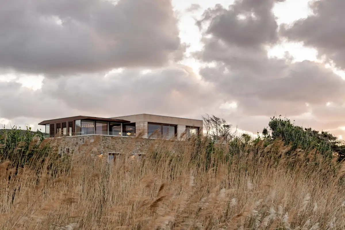 At ground level, an extra layer of local Jersey granite wraps around the rammed earth core, forming a highly solid, protective wall that shelters the interior from the turbulent elements. A colonnade runs along two sides of the house, forming a covered terrace that offers shade and protection from rain while still maintaining a connection to the landscape.