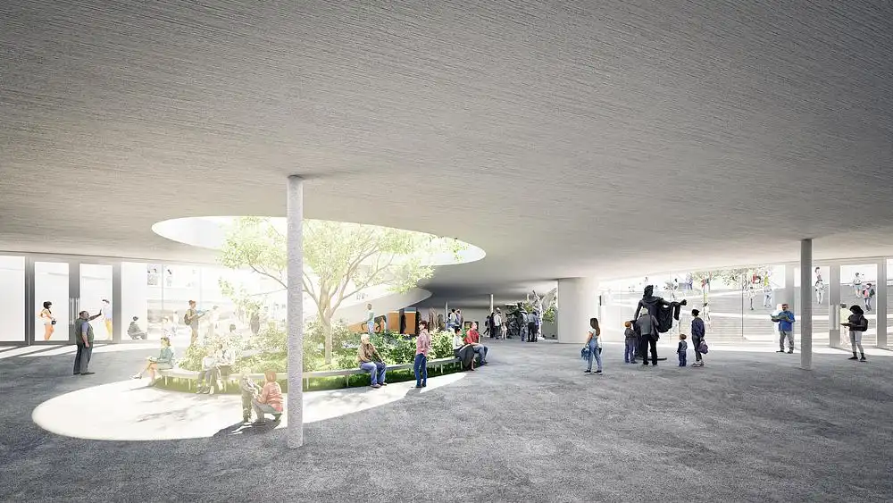 The architectural organization establishes a continuous spatial sequence connecting the city, the waterfront, and the harbor. Public circulation routes are arranged to allow movement across and through the site, rather than concentrating activity within a single enclosed volume. In this configuration, the museum functions as part of the broader waterfront network, supporting both programmed cultural activities and informal public use as part of everyday urban life.