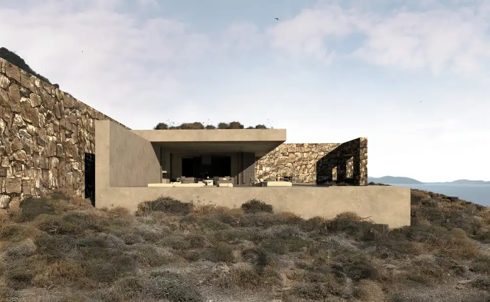 Located in Syros, Greece, Horizon House sits on a steep slope overlooking the Aegean Sea. The 230-square-meter residence is partially embedded in the earth, allowing the landscape to shape both the form and performance of the building. Stone excavated from the site is used for structural walls and cladding, reinforcing the house’s material connection to place. The design employs reclaimed wood, raw concrete, and native vegetation, resulting in a low-carbon, locally-grounded palette.