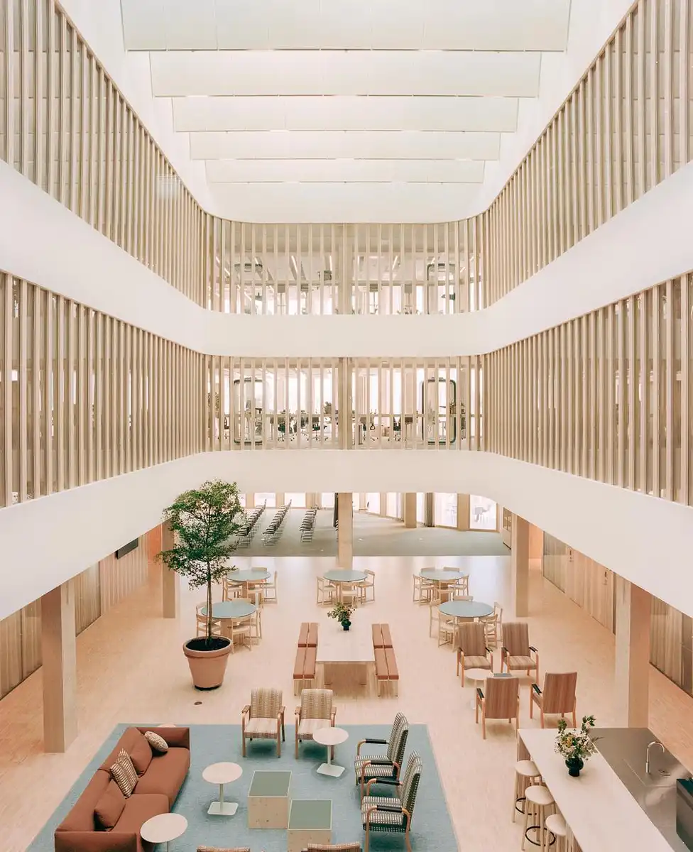 Besides wood, the light gray granite used on the facades and on the pavement outside, as well as inside, connects the building to its urban environment. The outdoor spaces of the building are inspired by northern nature and feature a birch grove in the courtyard and archipelago meadows on the rooftop.
