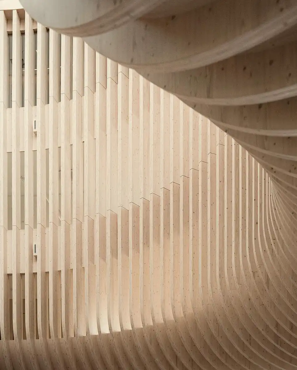 The post-beam frame and the structure for the façade are made of Laminated Veneer Lumber (LVL) produced in Varkaus, Finland. The inner walls and lift- and staircase shafts that stiffen the structure, as well as the floor and roof structures, are made of Cross Laminated Timber (CLT) produced in Gruvön, Sweden. The entire frame consists of 7,600 m³ of spruce and 2,500 wood elements.