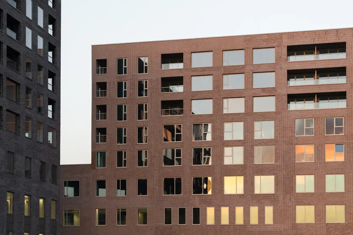 Each building is characterized by a distinct tone within one color family, featuring earthy tones of deep red, soft cream-white and green-grey. The concrete base façades and window frames follow a ton-sur-ton palette, allowing each structure to read as a cohesive sculpture. The façades feature a patches pattern, each with its own brickwork style, window size, and reveal depth. This approach gives the buildings a layered appearance, while still clearly belonging to one architectural family.