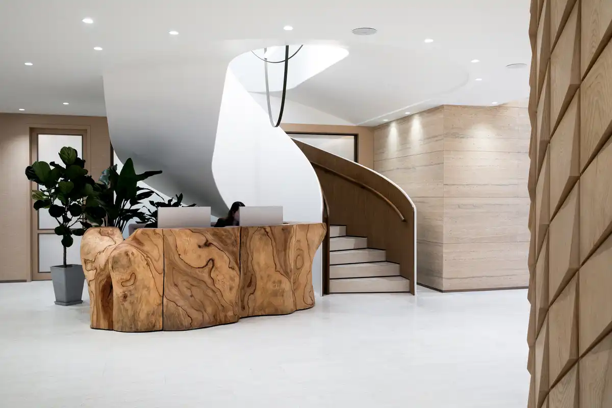 Our approach to the sustainability requirement sees both spaces prioritise recycled, reused and upcycled materials as well as sustainable choices such as bamboo, in addition to a design process that aimed to minimise waste at every step. The reception desks at each office stand out, with each being crafted from salvaged tree trunks. This holistic approach helped Hang Lung to achieve positive outcomes in its third-party RESET project assessment, which includes elements such as carbon embodiment and circularity.