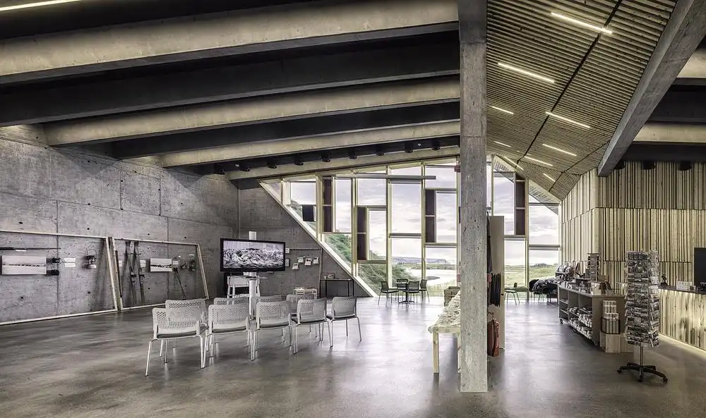 The main structure of the building consists of precast concrete panels with a corrugated exterior finish. The exhibition space floors are polished concrete, divided into sections, each featuring river gravel from the largest glacial rivers of the western area of Vatnajökull National Park. These elements are part of the exhibition itself, integrated into the building. The roof is covered with turf sourced directly from the site itself and all surface water from the roof is directed into landscape ponds. All materials were carefully selected for their low maintenance requirements—eliminating the need for outdoor paint and allowing for natural weathering without compromising durability.