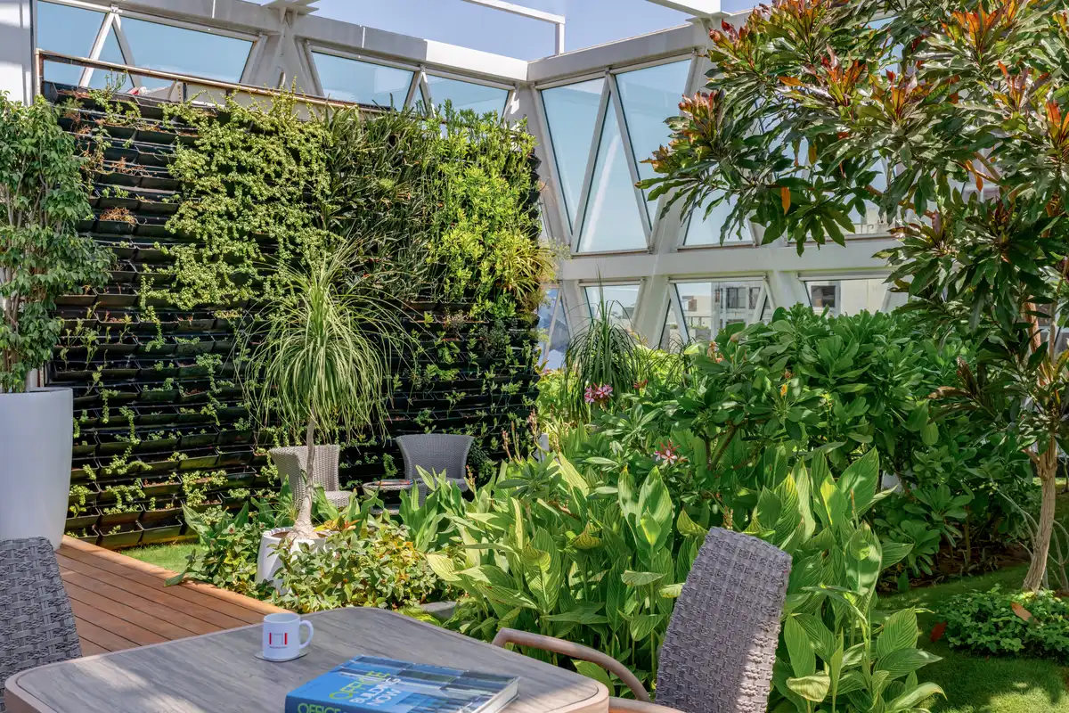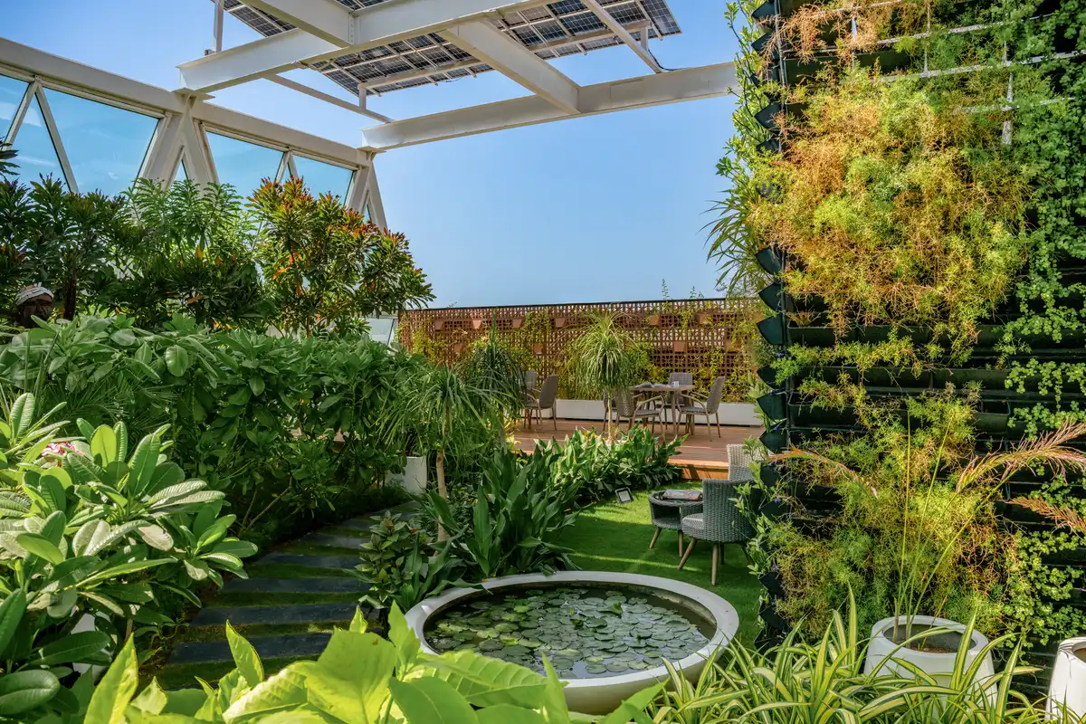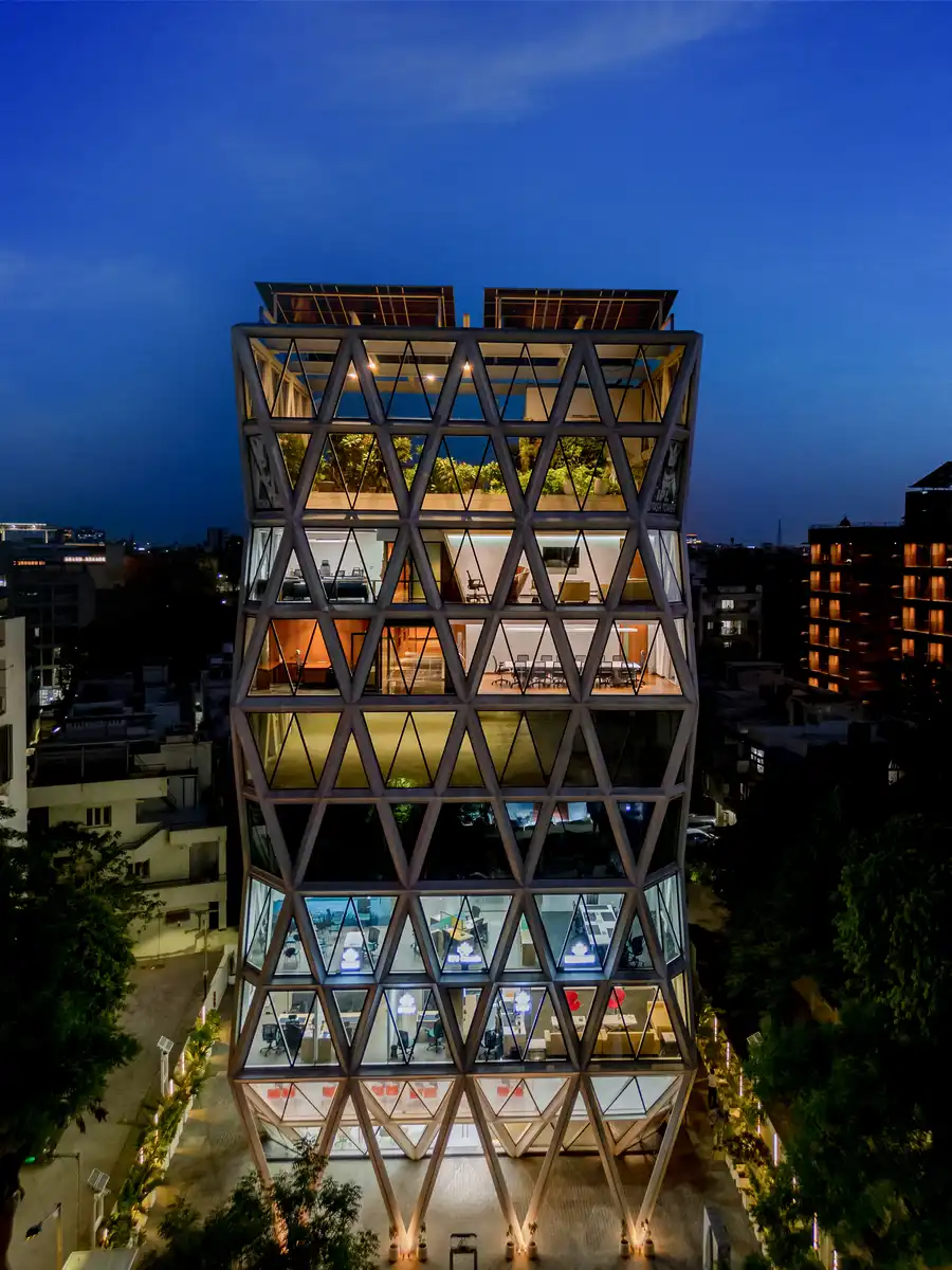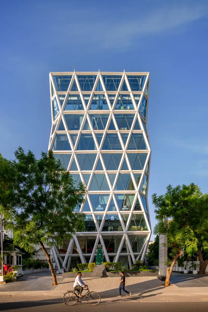 Prioritizing Sustainability and Climate Responsiveness : The efficient planning of the south-western core and compact floor plate allow the entire interior space on every floor to be lit up by glare-free northern sunlight, while remaining shaded from the harsh sun. A double skin ceramic fritter high performance glazing system within the dia-grid with an interstitial air-cavity insulates the inner spaces from radiant heat, consequently reducing the load on air-conditioning. The aesthetically designed terrace garden serves as a sustainable oasis, mitigating heat gain, fostering social interaction among employees, and harnessing solar energy through integrated PV panels, embodying both functionality and environmental consciousness. Many such passive as well as active sustainability strategies employed qualify the building for an IGBC Gold rated Green Building certification.