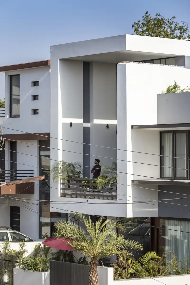 The design narrative of the Sky Box House was inspired by the youngest family member, a pilot by profession, and his fascination with aerial forms, evoking the illusion of a structure suspended in mid-air. This concept is most strikingly realized in the 11-foot cantilevered block that anchors the front façade, housing a double-height semi-open space. The interplay of proportions is further emphasized by a full-height glass screen that reveals a sculptural, metallic grey staircase.