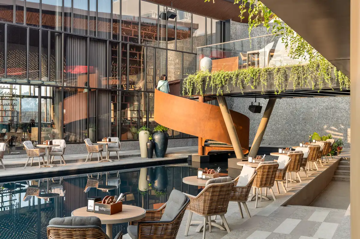 to enhance engagement with the water, the courtyard incorporates tiered floor levels with dining pockets at different elevations. A floating bridge deck spans above the central pool, accessed by a spiral staircase, offering elevated views of the cascade and layered user movement. This creates one of the project’s signature experiences—visitors encounter people circulating vertically, making the space feel active and animated from entry.