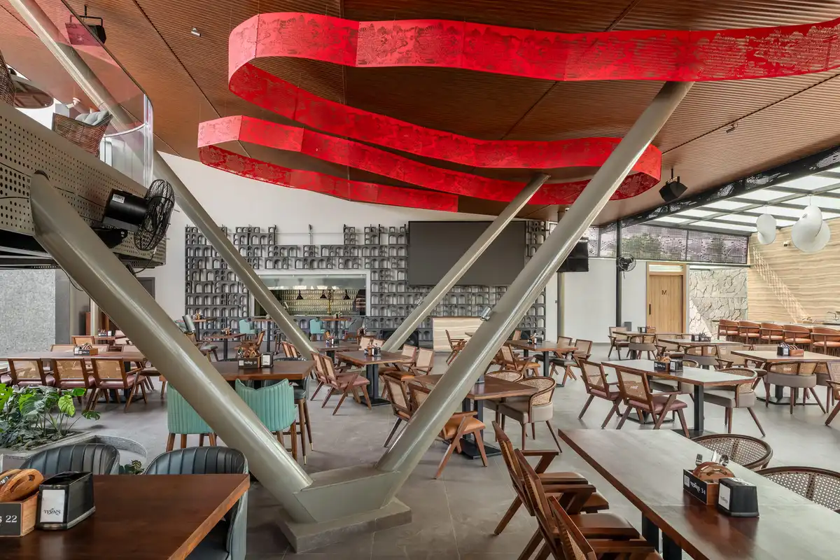 With the glass panels defining the enclosure, the interiors are animated through suspended installations and focused lighting. Q3 pendant lights frame the bar and dining zone as a visual anchor, while an aluminum partition with miniature bird figurines faces the courtyard, adding a crafted layer of detail. In the semi-outdoor area, a red ribbon-like metal installation etched with a cityscape introduces movement and color overhead. At the café core, clustered paper lanterns soften the atmosphere, balancing the structural expression with a warmer, more tactile character.