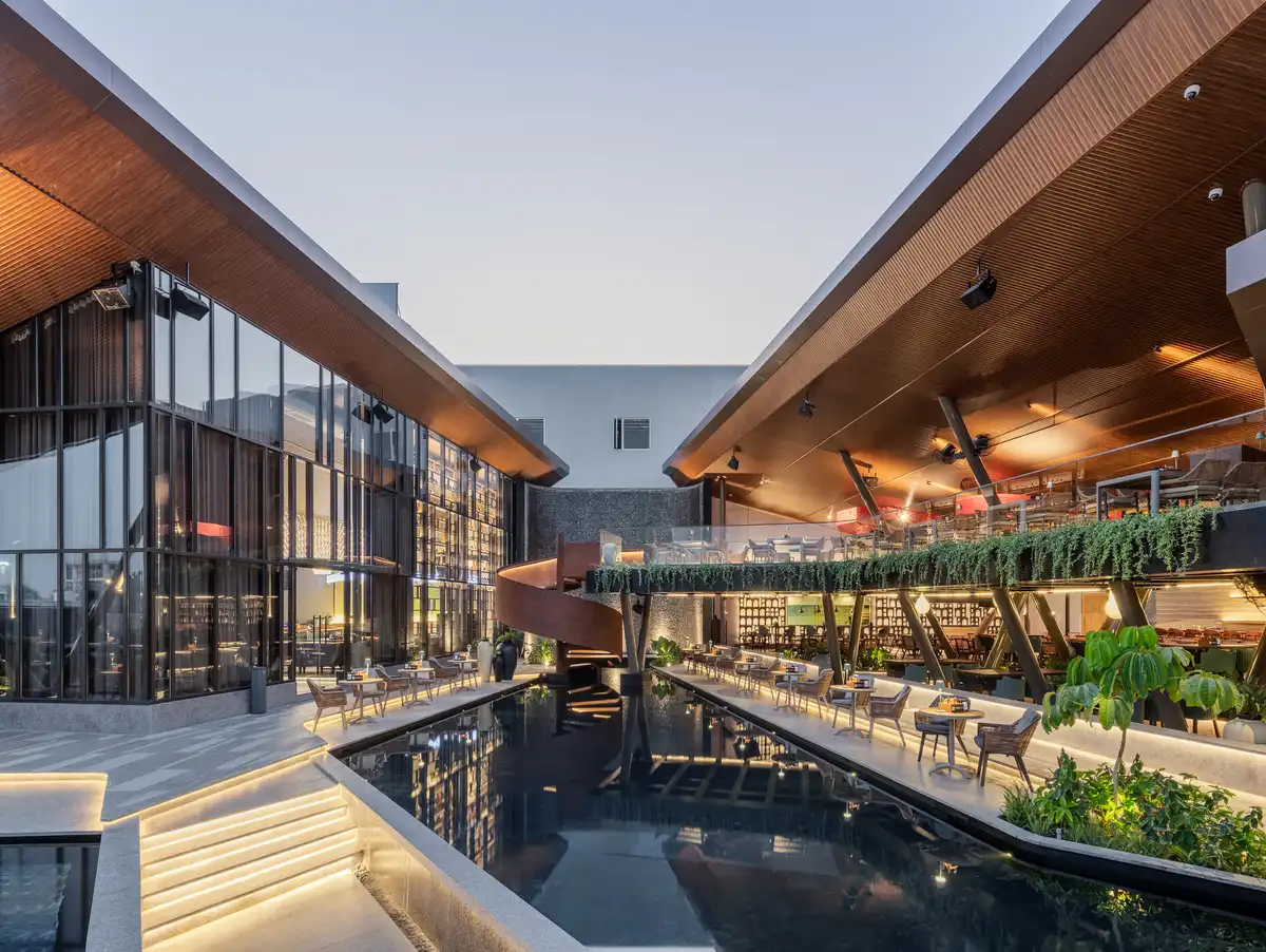 Rules required a large portion of the site at the perimeter to be remaining open to the sky, limiting construction. This area was reinterpreted as a landscape spine with water bodies, planting, and stepped outdoor dining pockets. What began as a restriction became one the key spatial feature, creating a buffer from the surroundings and giving the project a sense of being enclosed in its own landscape.