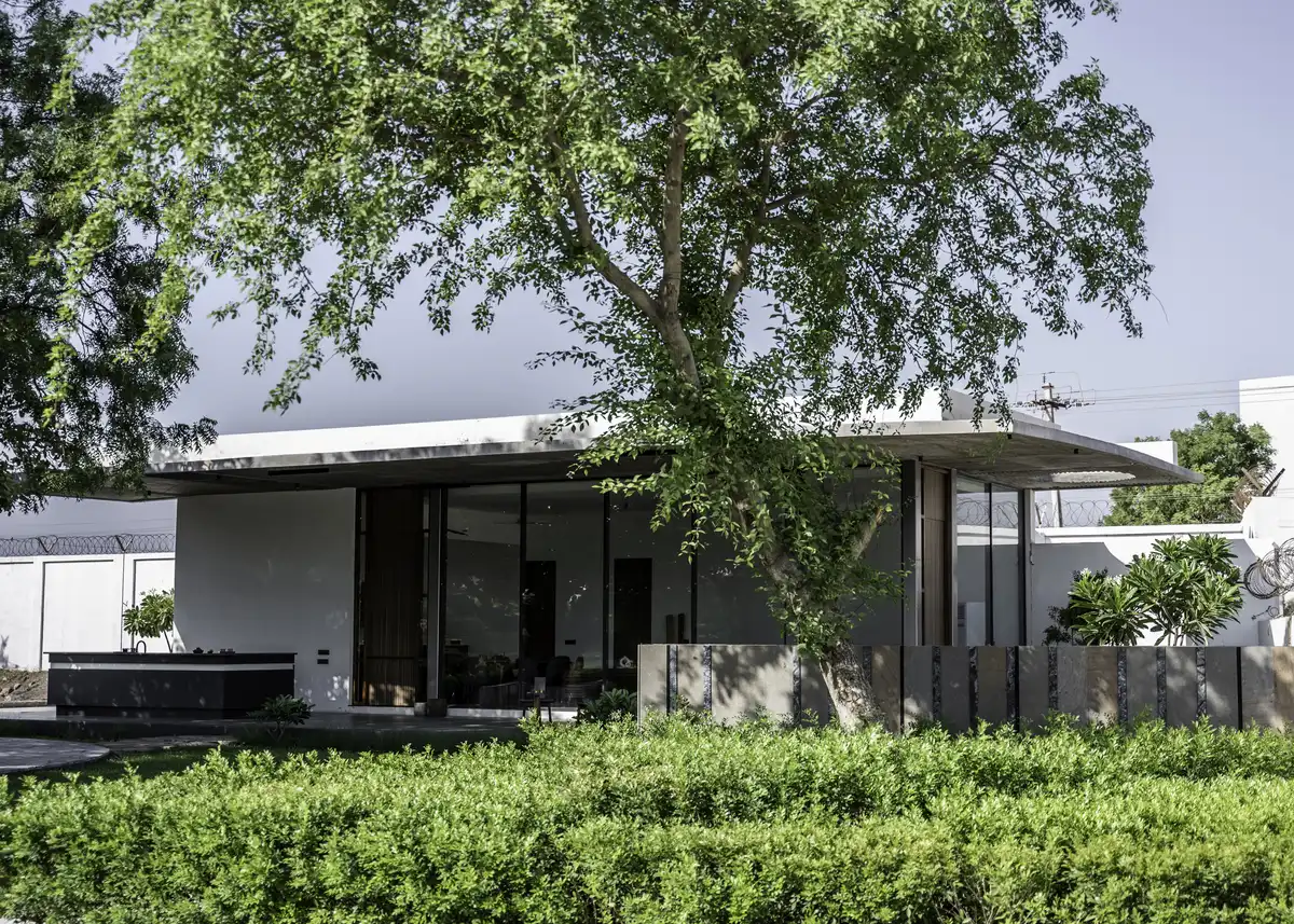 Against this backdrop, the architectural intervention remains intentionally modest, occupying only a small fraction of the estate. The entry unfolds along a central axis, leading to the villa sited on the bedrock of the demolished structure to preserve the fertile black soil. The landscape is divided into two gardens — one, a private foreground adjoining the villa, enclosed by the banyan trees; The other, a larger lawn opening toward the mango orchards, culminating in a gazebo that serves as a vantage point for celebrations and community gatherings.