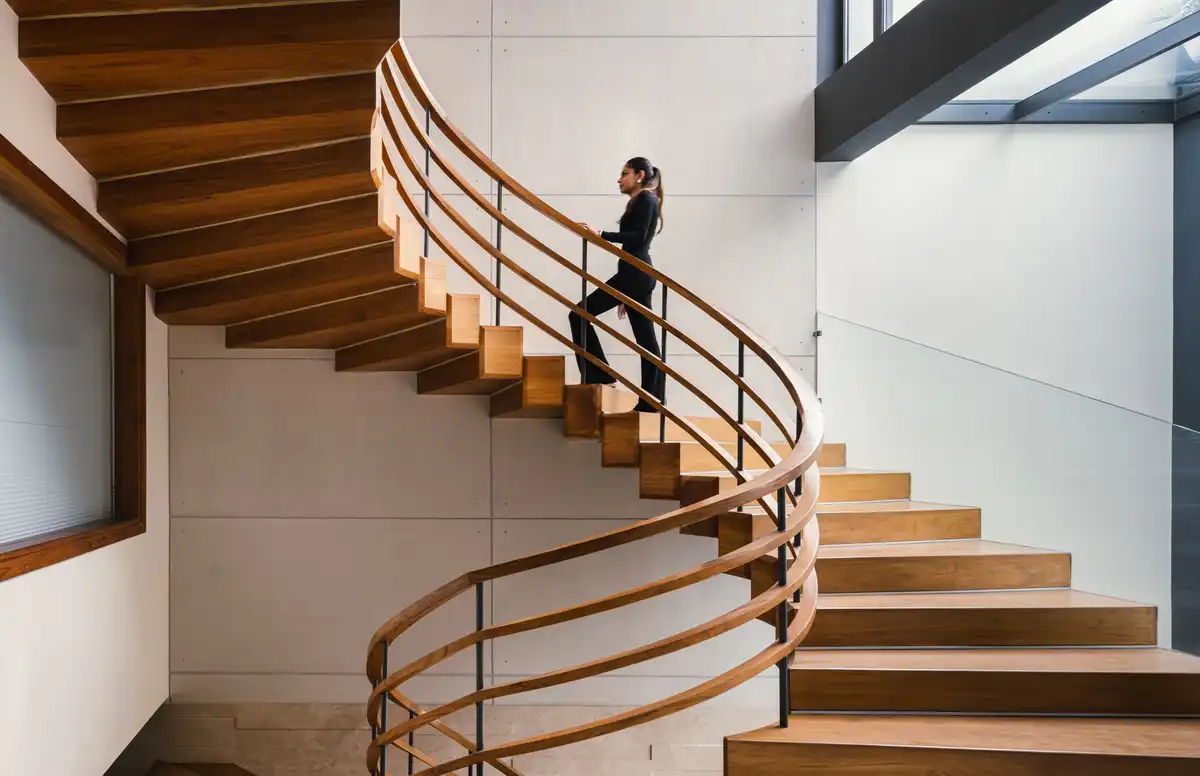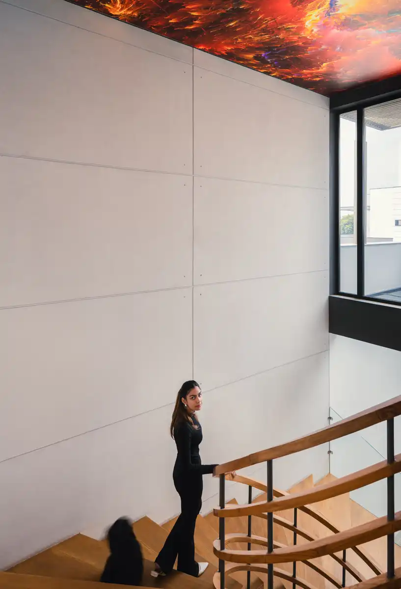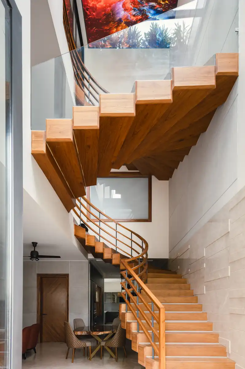 Crafted with wooden balustrades that wrap like ribbons along the spine of the stairs, the structure becomes a central art piece, spiralling through a triple-height atrium. As sunlight moves across the day, the staircase transforms in character — glimmering like a jewel, anchoring the home with both weight and wonder.