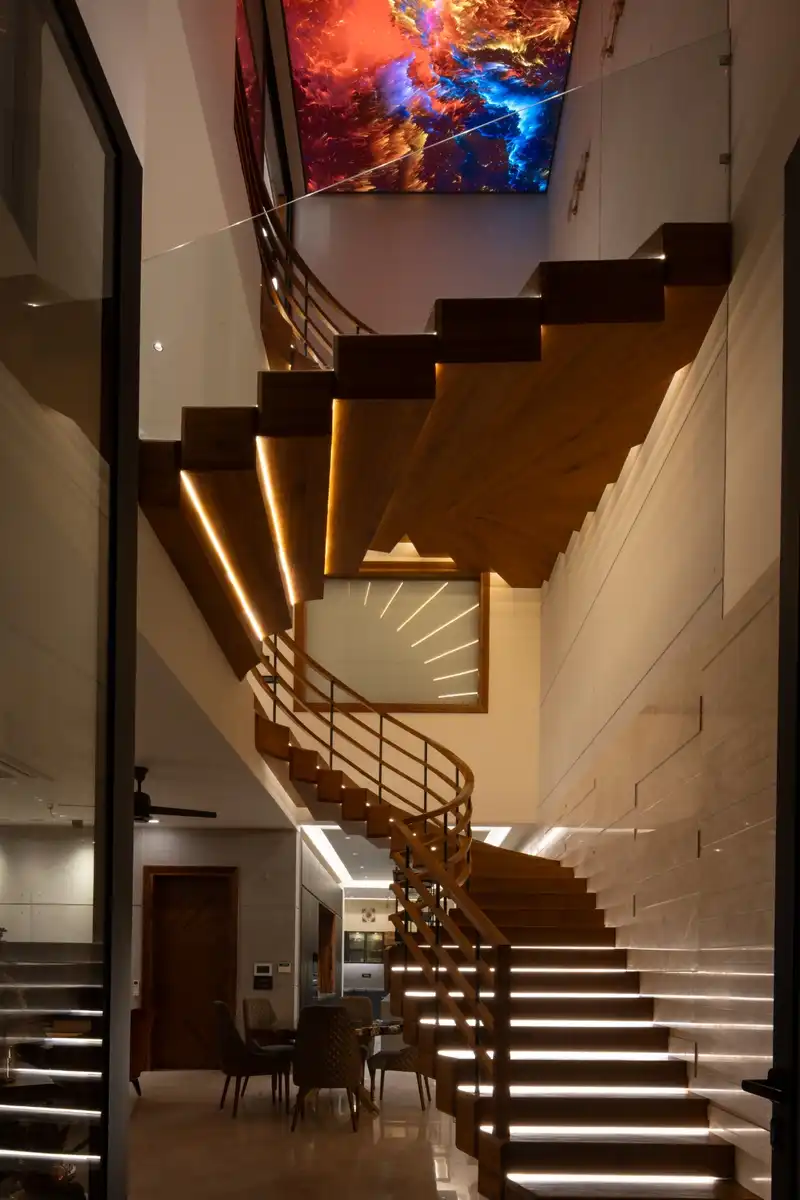 At the heart of the home lies a sculptural staircase — a bespoke creaon shaped like the Indian rupee symbol. This design not only honours the client’s identy as a builder but subtly ties economic symbolism with artistic expression. The staircase steps resemble gemstones embedded in a necklace, a nod to the hidden treasures of ancient caves.