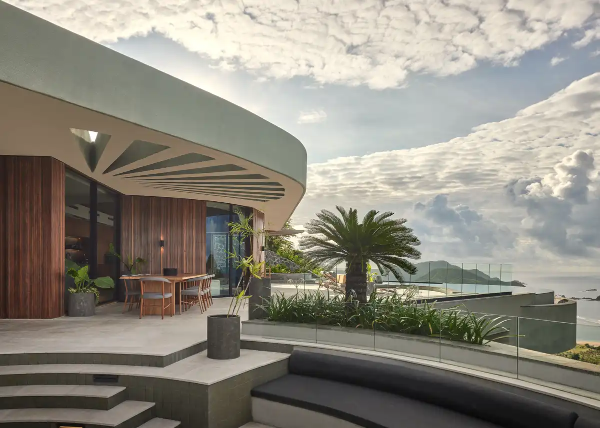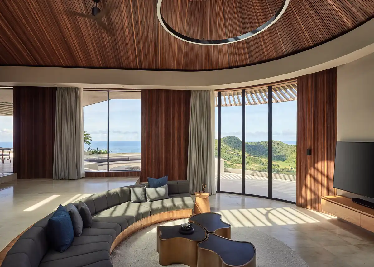 The gesture is clear but measured. Rather than rely on spectacle, the design allows the form to emerge through logic—through topography, view lines, and movement. Each curve, each transition, has a reason. The use of warm teak ceilings, off-white walls, and pale Palimanan stone floors reinforces this approach. Materiality stays calm and consistent, helping the architecture recede into the landscape even as it offers a strong silhouette from a distance.