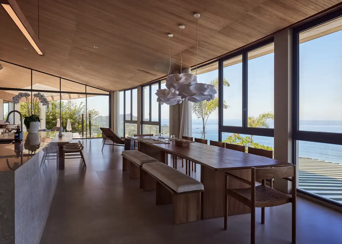 The indoor–outdoor relationship is central to how the building works. The pool, for example, isn’t just a separate feature but part of the overall living landscape. It flows from the inside out, broken up by level shifts and soft transitions.